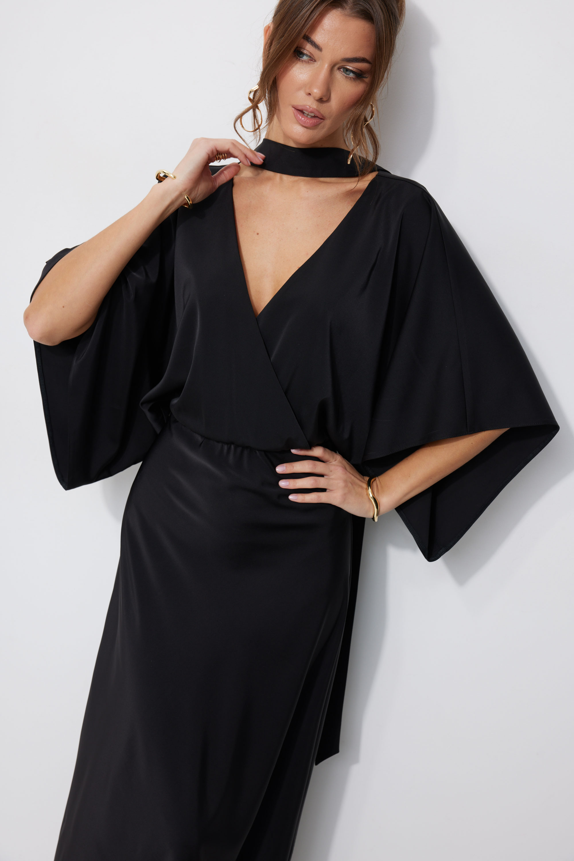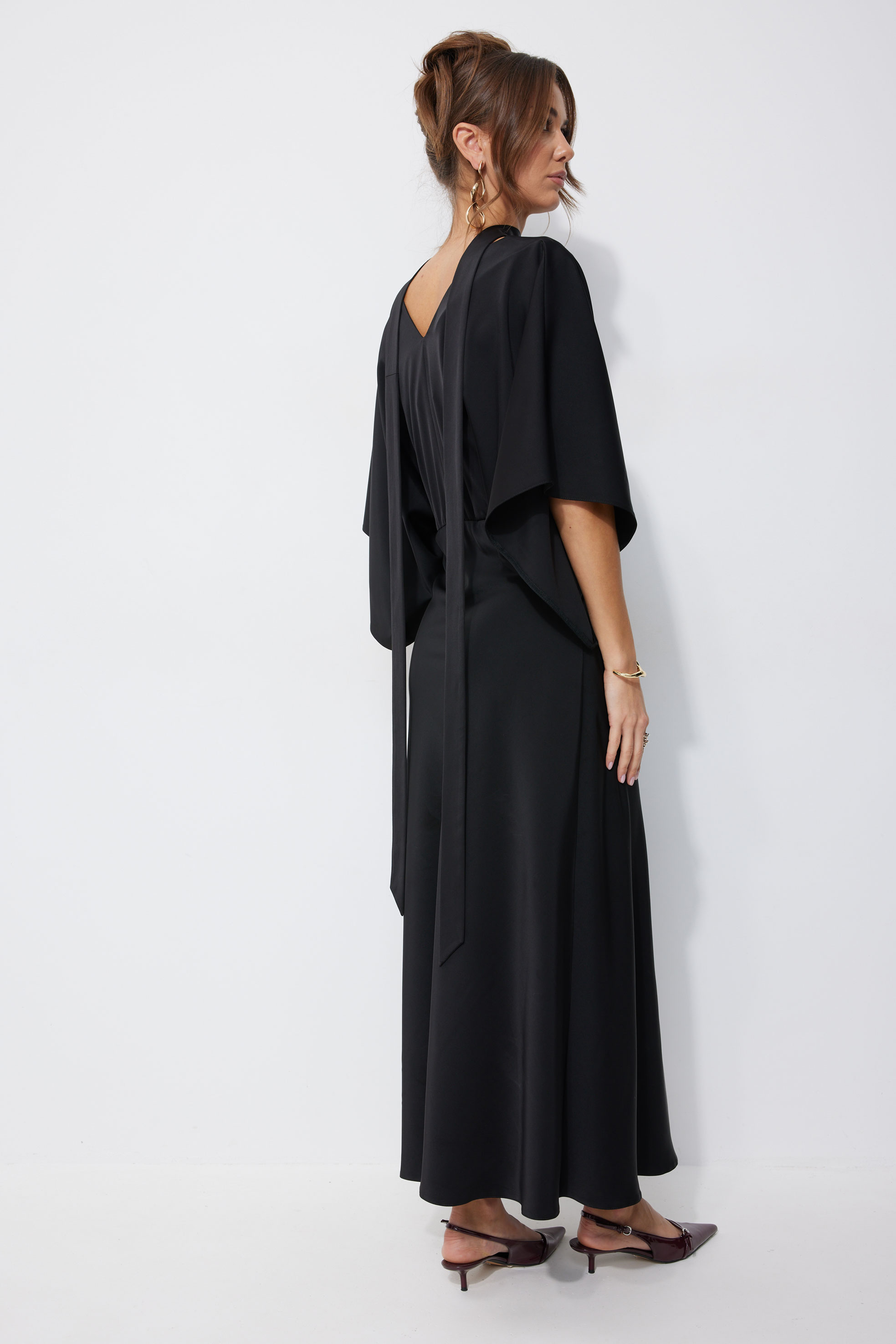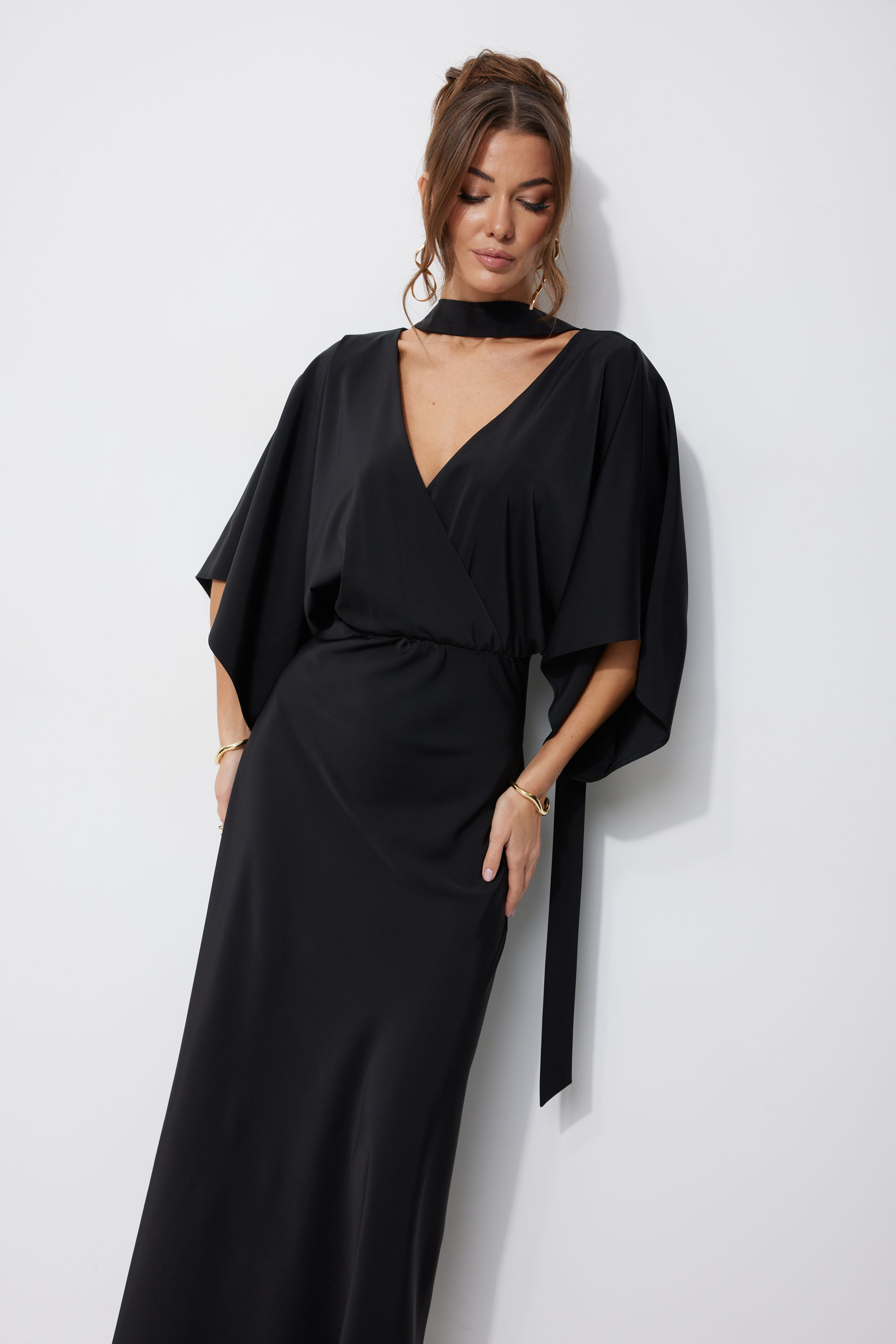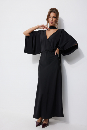 Платье 4252 (черный) 3060 44-54 Нарядное платье из струящейся ткани, длина макси. Платье полуприлегающего силуэта. Отрезное по линии талии, с резинкой. По переду запах. По спинке глубокий V-образный вырез горловины. Рукав цельнокроеный, расширенный, длина немного ниже линии локтя. Юбка покроена по косой, силуэт расширяется к низу. Платье дополняется мягким поясом из основной ткани. Его можно использовать, как шаль, повязав на шею, либо, как пояс - на талию. "Длина платья (44-48р 142 см) (50-54р 143 см).
