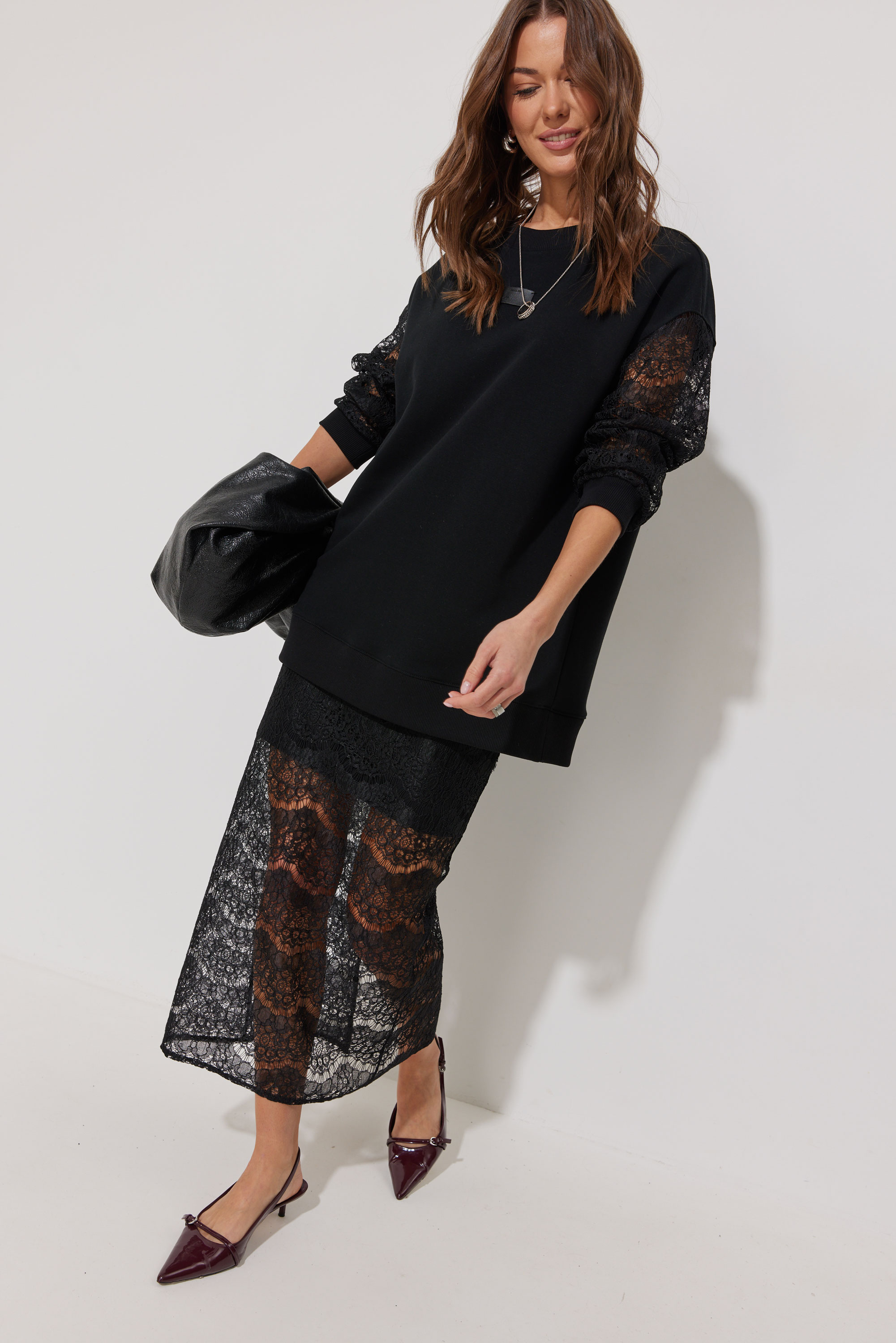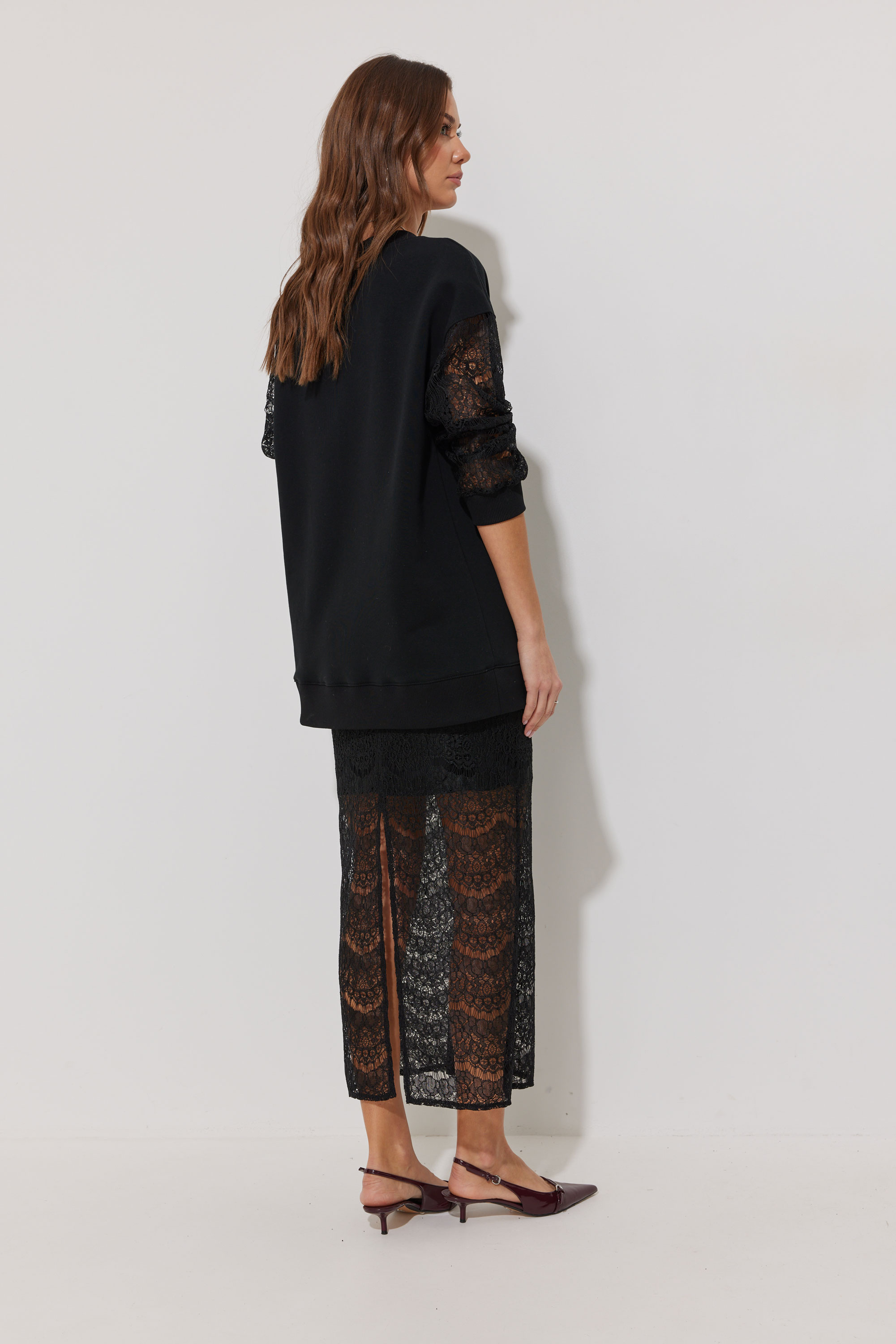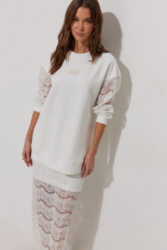 Юбка выполнена из кружевной ткани, длина миди. Юбка прямого силуэта. Нижний слой юбки выполнен из тонкого трикотажа в тон основной ткани. Юбка на резинке. По среднему шву заднего полотнища разрез." "Длина джемпера во всех размерах 73см.