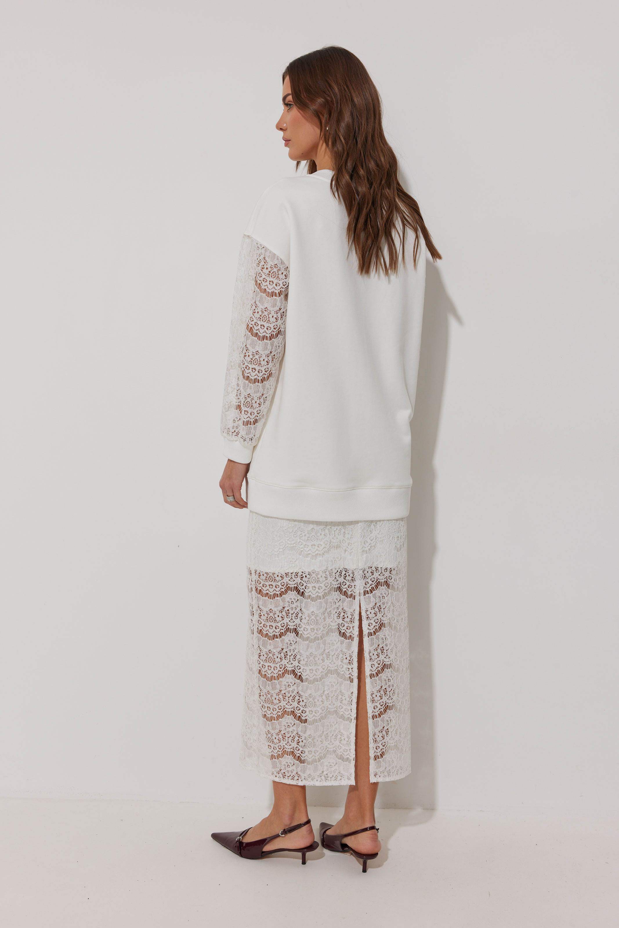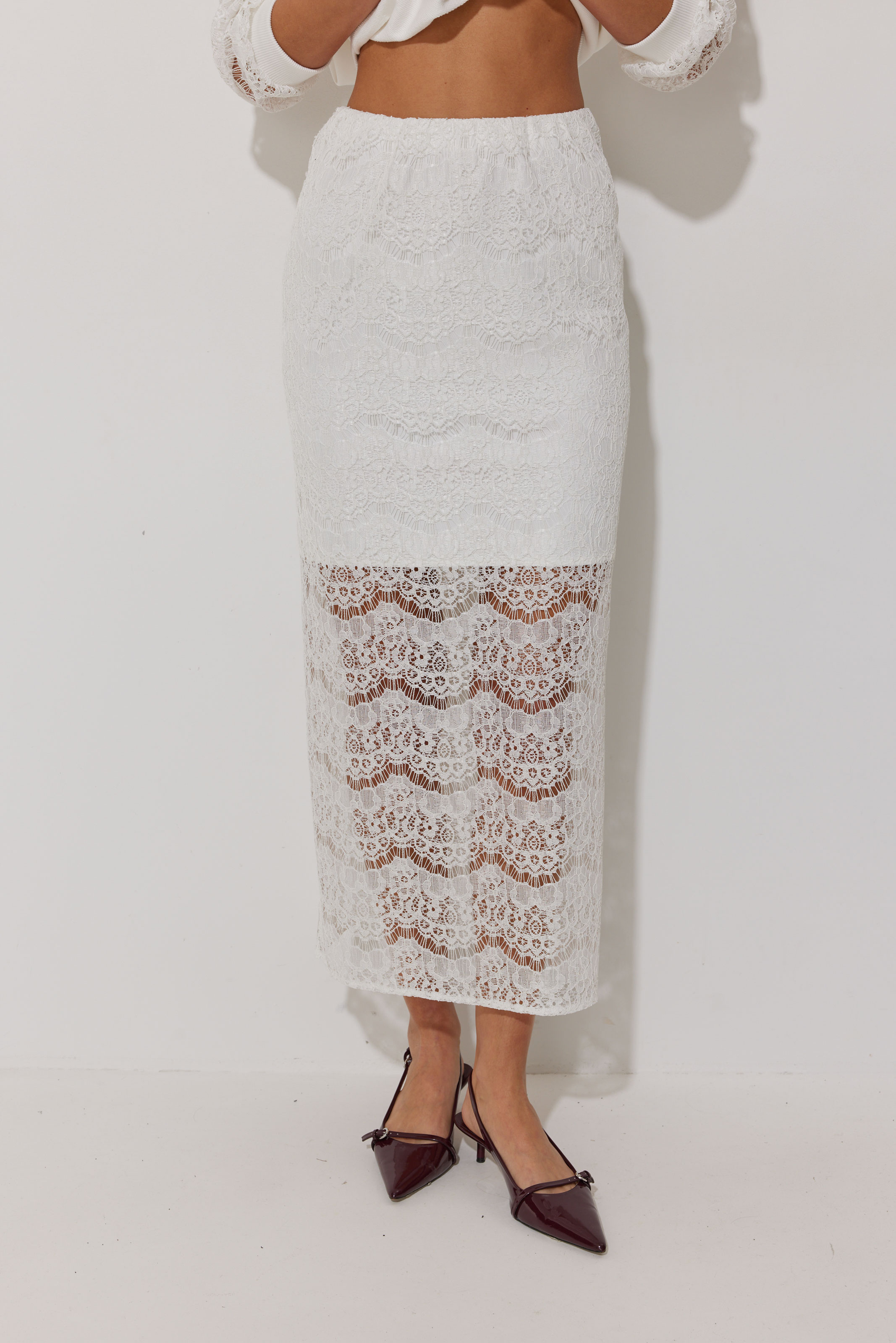 Юбка выполнена из кружевной ткани, длина миди. Юбка прямого силуэта. Нижний слой юбки выполнен из тонкого трикотажа в тон основной ткани. Юбка на резинке. По среднему шву заднего полотнища разрез." "Длина джемпера во всех размерах 73см.