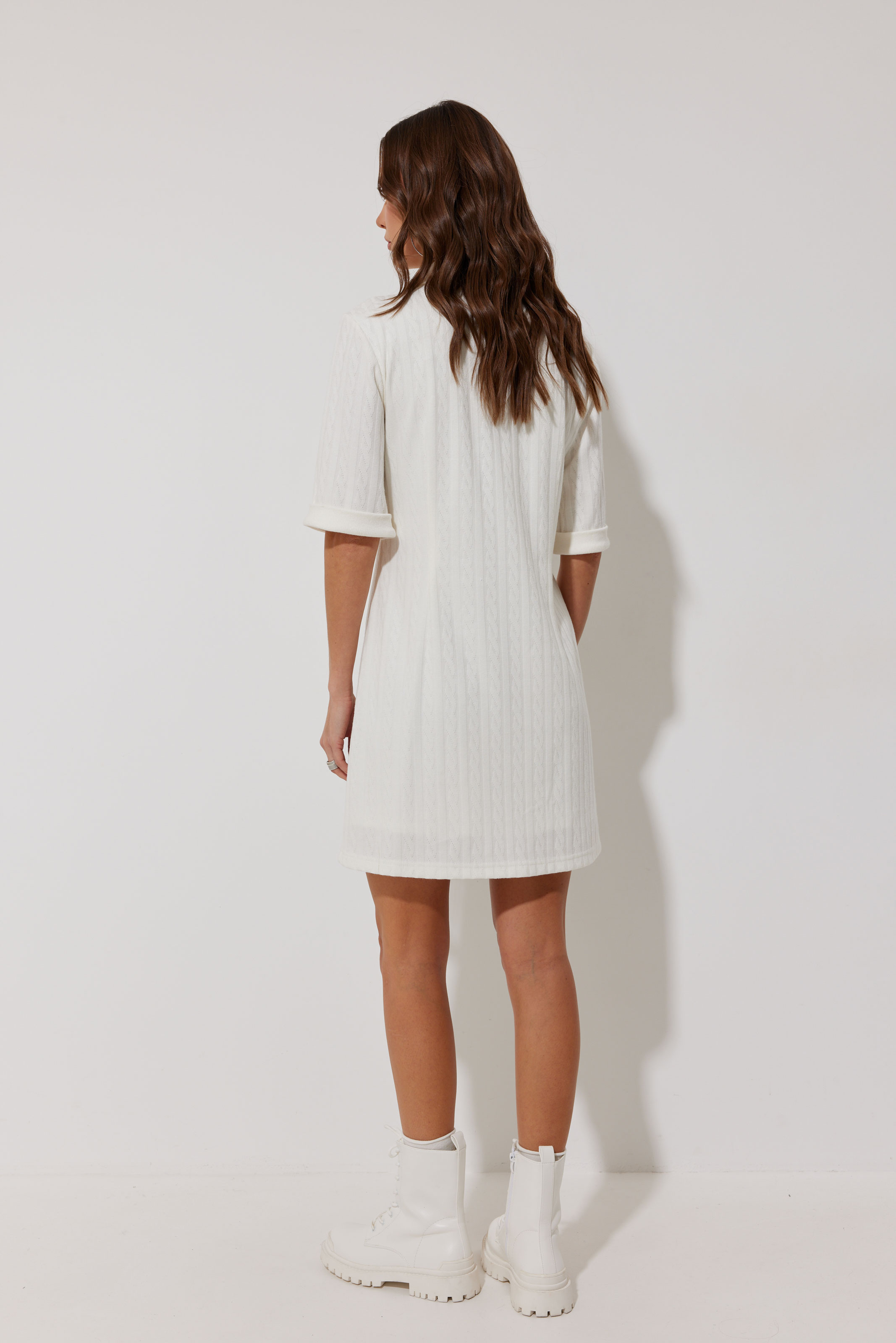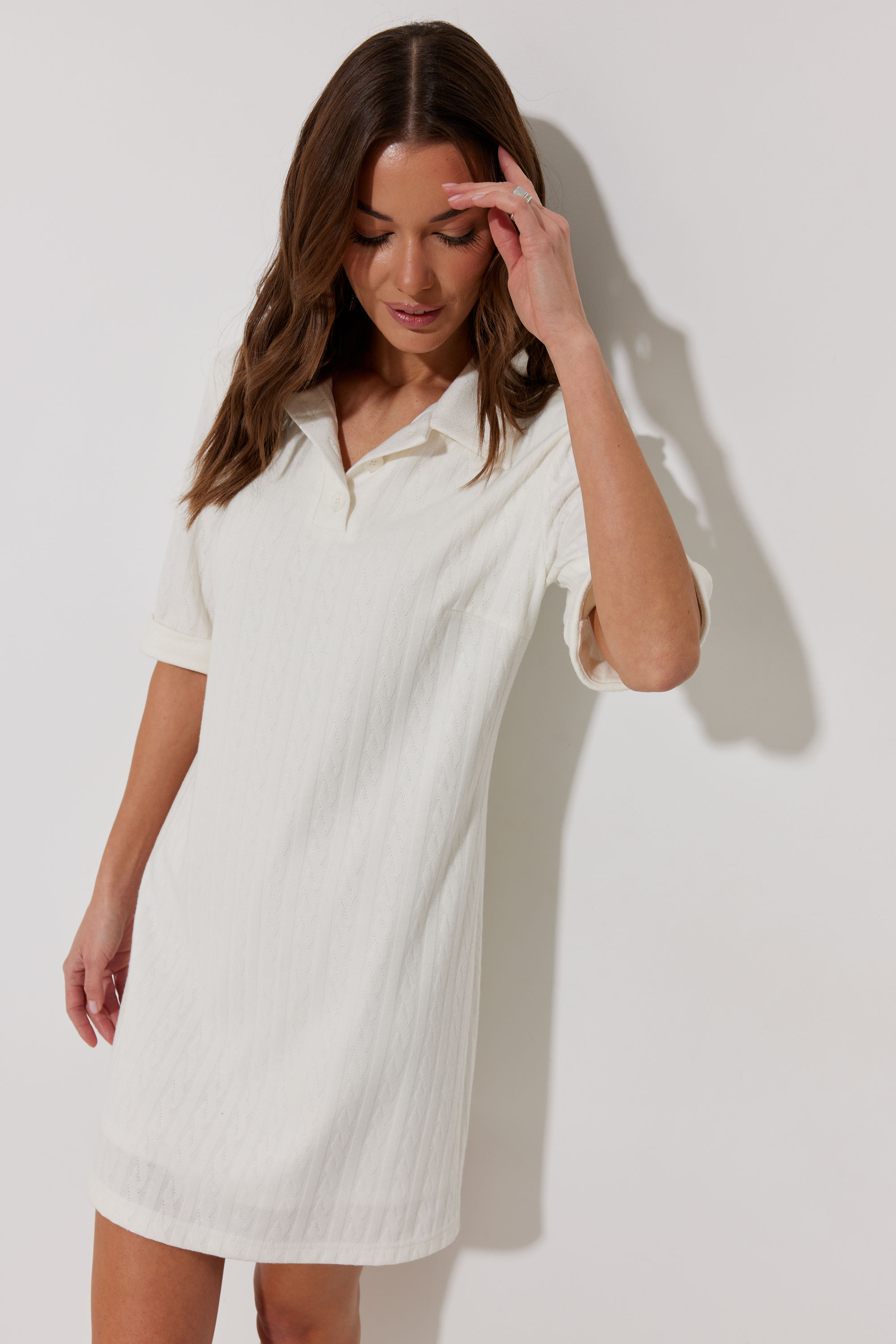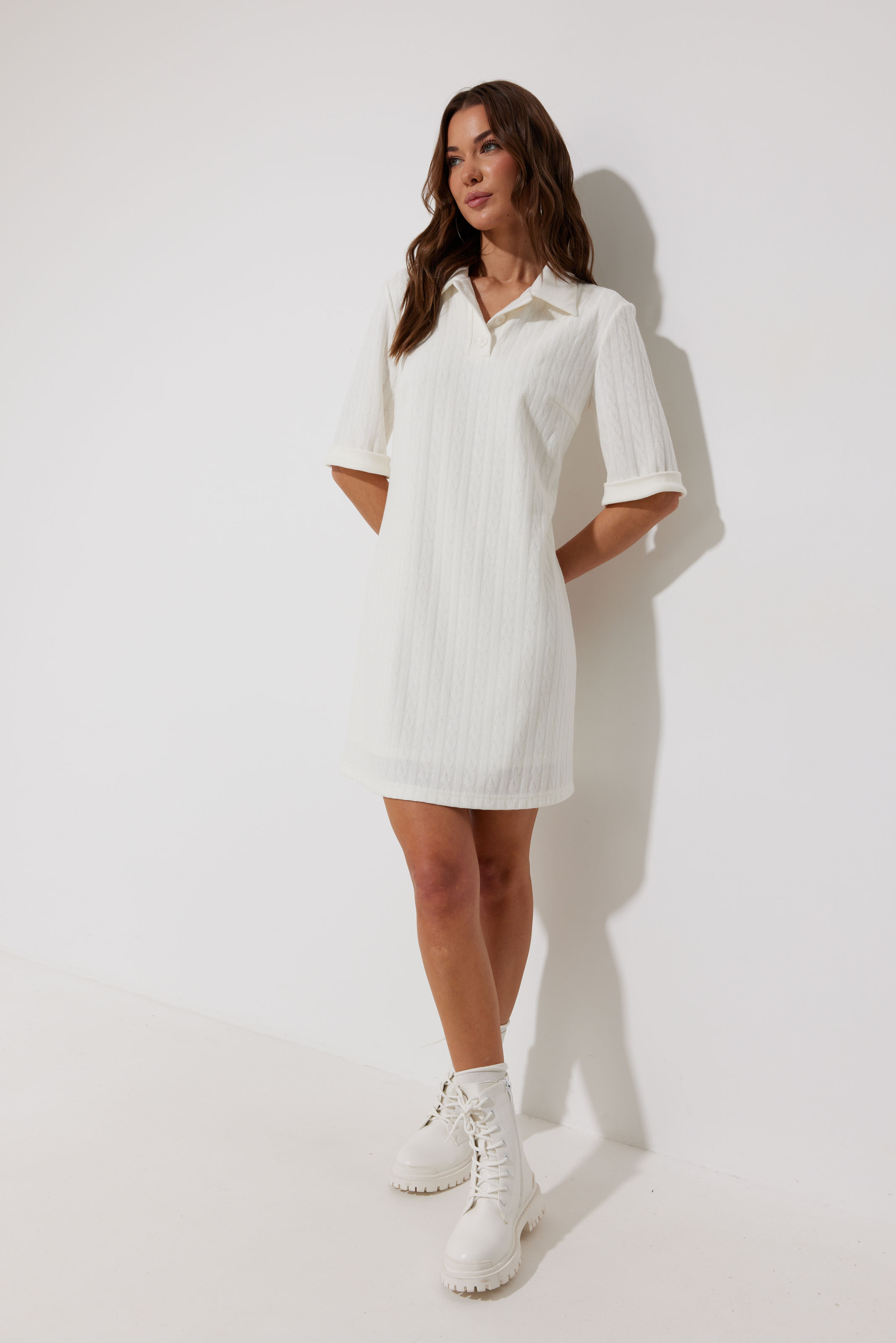 Платье 4267 2975 44-54 Платье-поло из трикотажного жаккардового полотна. Длина мини. Платье свободное, с небольшим расширением к низу. С отложным воротником. По переду планка с застежкой на петли-пуговицы. По переду нагрудные вытачки. Рукав короткий с отложной манжетой. Воротник, планка и манжета выполнены из трикотажного полотна в тон основной ткани. Платье на трикотажной подкладке. Обращаем Ваше внимание, что фурнитура может незначительно отличаться от фото. "Длина платья (44-48р 88 см) (50-54р 96 см).