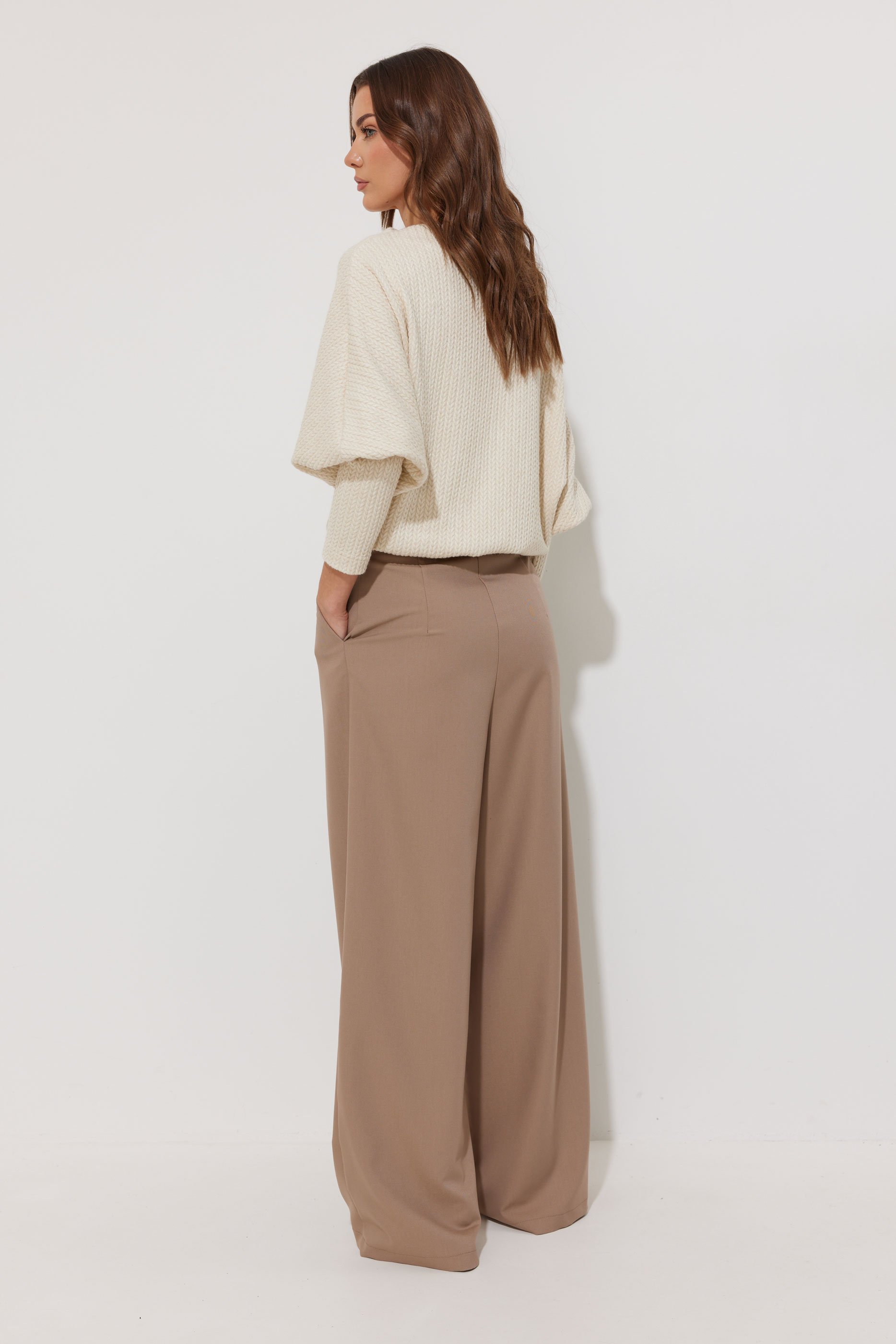 Брюки 4272 (бежевый) 2975 44-54 Брюки из поливискозной ткани, прямого, расширенного силуэта. На передних половинах брюк по одной складке, выходящих из-под пояса. По переду застежка на молнию по типу гульфик. Брюки по переду с карманами в отрезных бочках. Пояс по переду с застежкой на хлястик, продевается через металлическую рамку и застегивается на две металлические пуговицы на ножке. Обращаем Ваше внимание, что фурнитура может незначительно отличаться от фото. По спинке в пояс вставлена резинка. На задних половинах брюк вытачки. Длина брюк (44-48р 109 см, пояс 4 см) (50-54р 110 см, пояс 4 см).