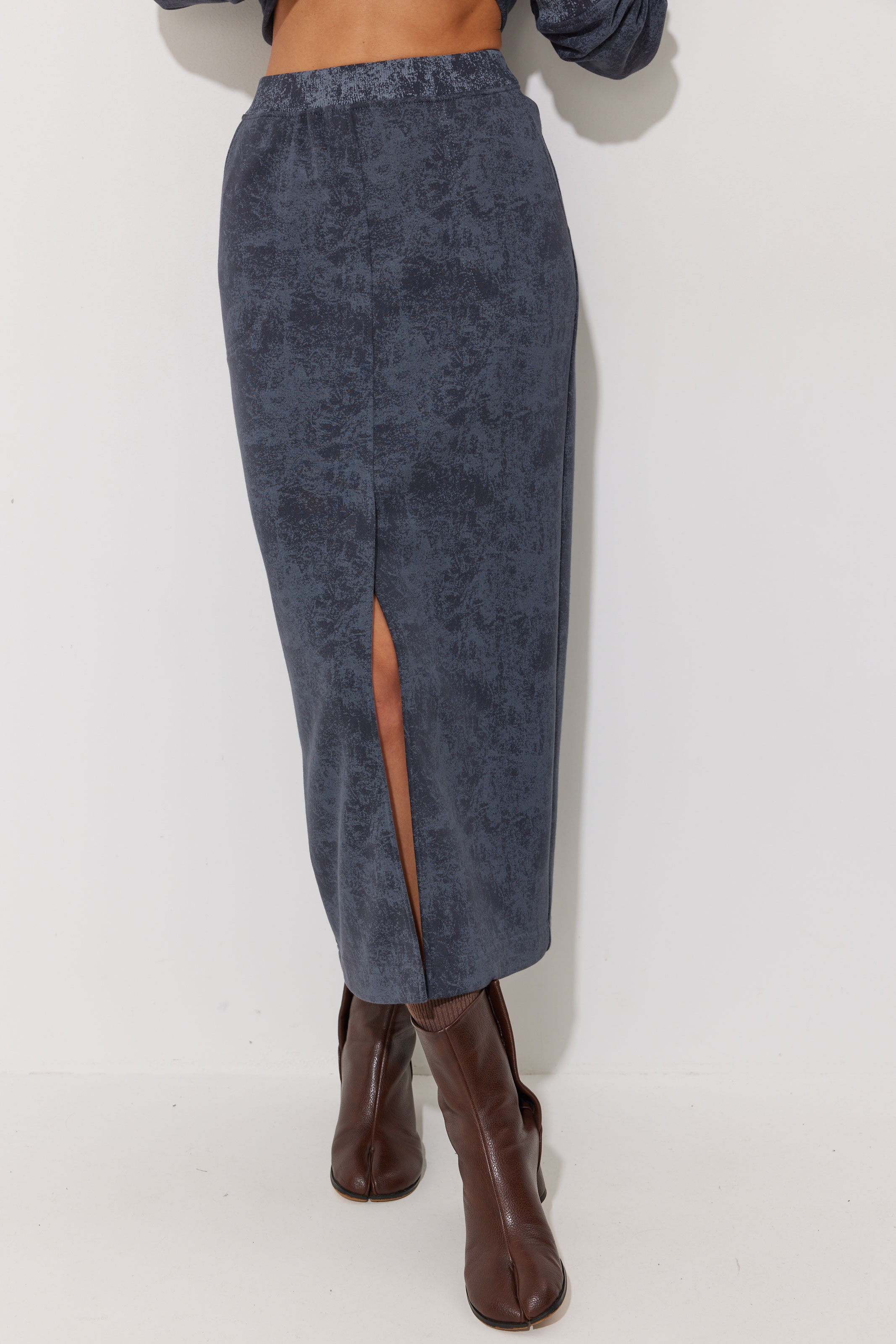Юбка полуприлегающего силуэта из трикотажного полотна. По верху юбки притачной пояс с резинкой. По переду средний шов со шлицей и карманы. На заднем полотнище юбки накладные карманы.
