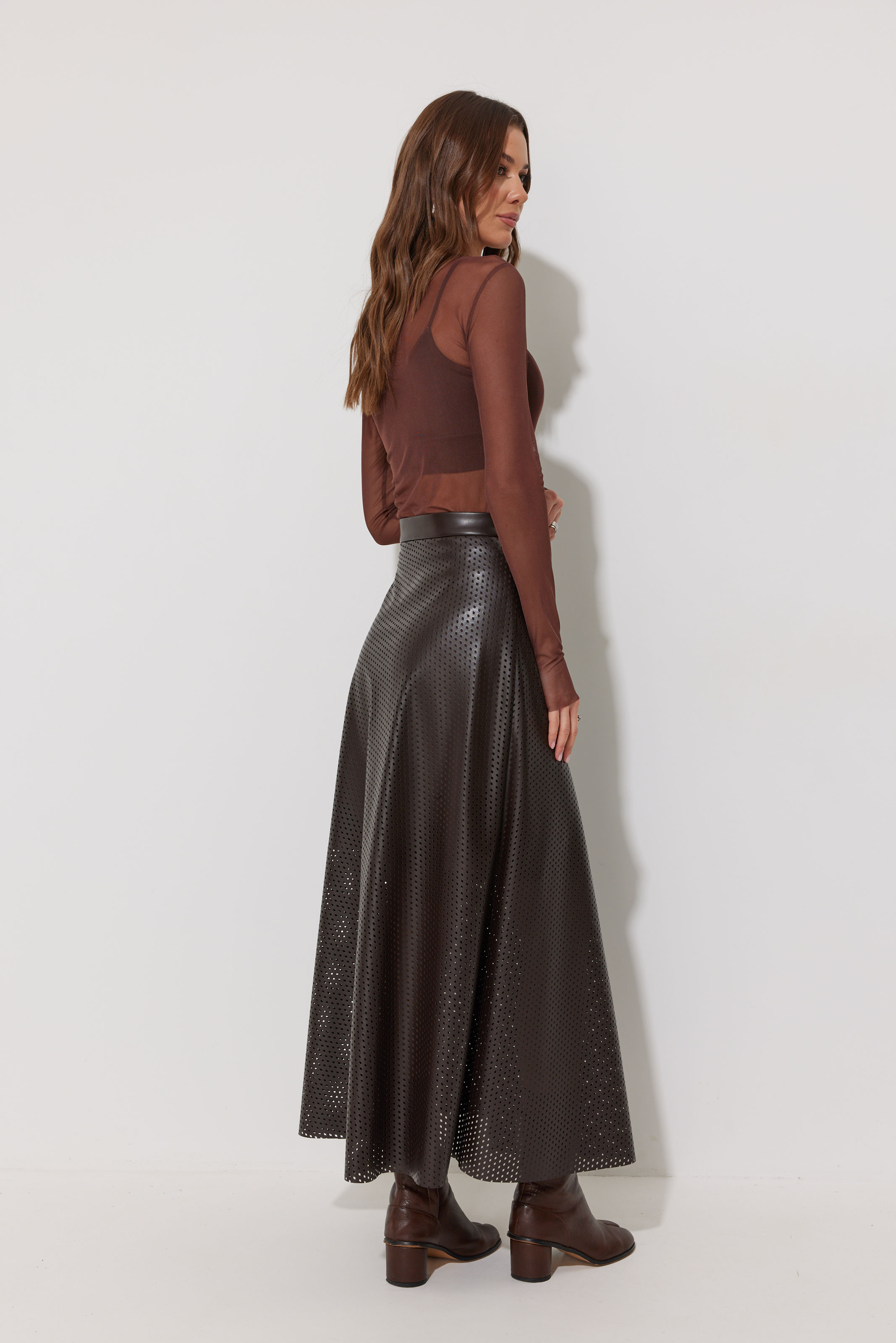 Юбка 4279 3230 44-54 Юбка двухшовная расширенная книзу из экокожи с перфорацией. По верху юбки притачной пояс, на спинке застежка на потайную молнию. Длина юбки 94+3,5 см пояс