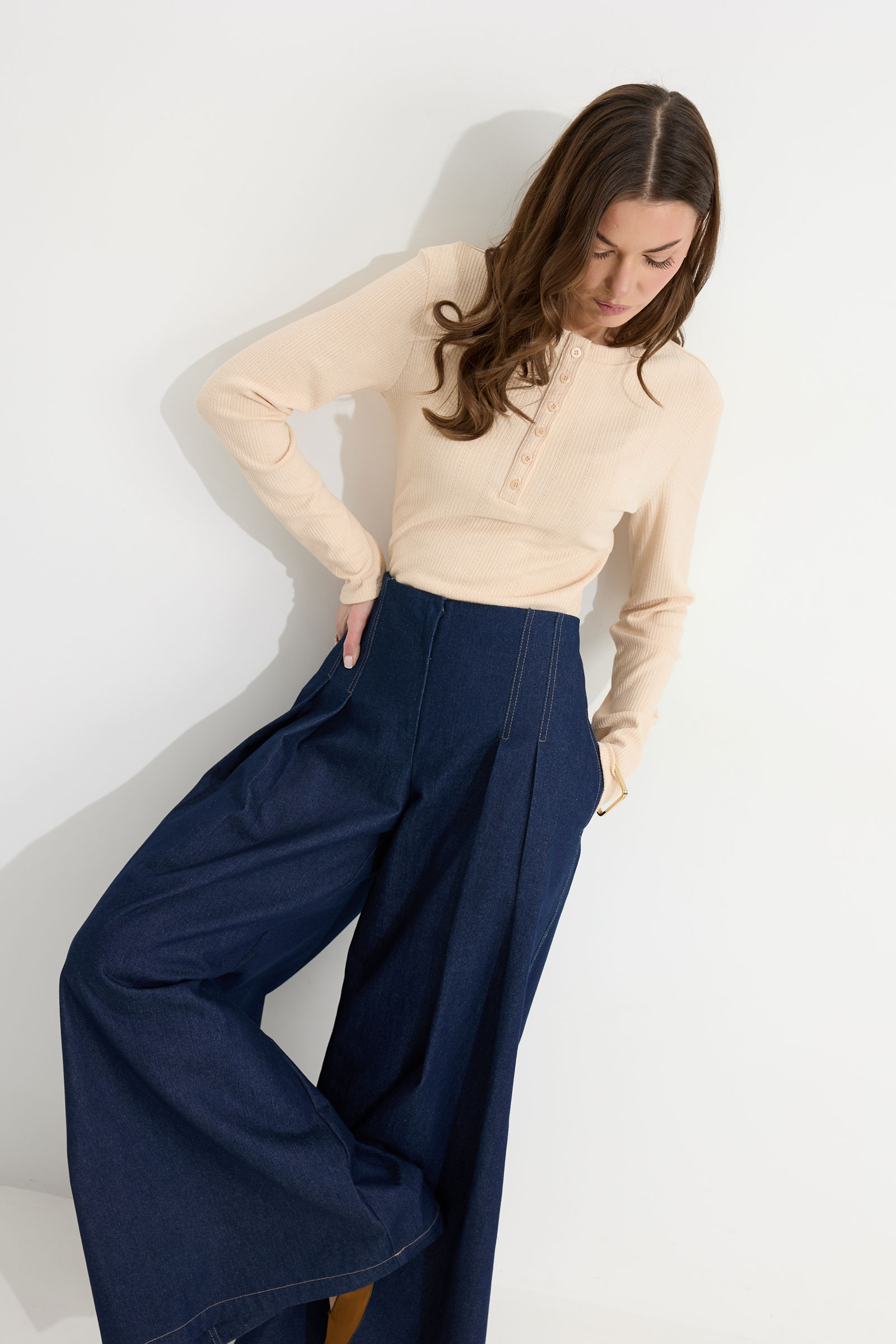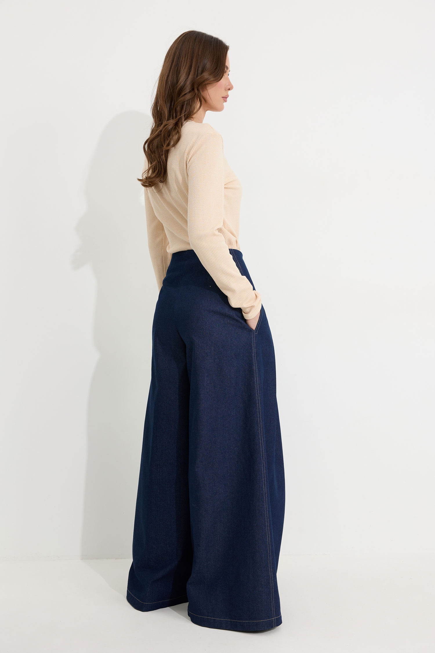 Брюки 4296 2720,00 44-54 Брюки-палаццо из хлопкового денима. Посадка до линии талии, с расширением от линии бедра. Без пояса, верхний срез обтачной. На передних половинах брюк по две складки, застрочены на 15 см от верха. По переду застежка на молнию по типу гульфик, а также на пришивную потайную кнопку и потайную пуговицу. На задних половинах брюк по две вытачки. Карманы в боковых швах. По боковым швам, входам карманов, складкам по переду, по подгибке низа проложены двойные отделочные строчки контрастного цвета. Длина брюк (44-48р 110 см) (50-54р 112 см).