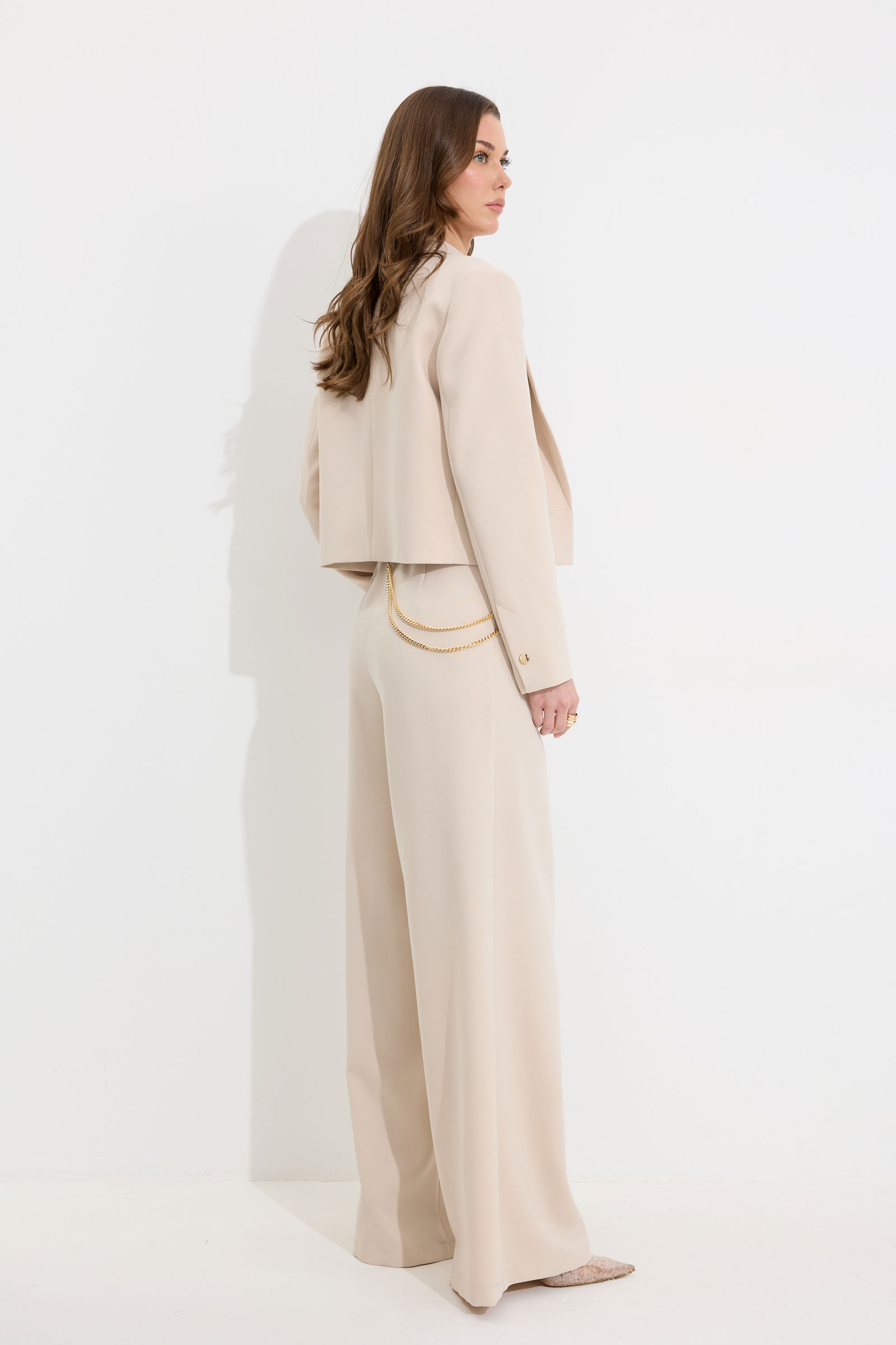 Костюм 4302 (бежевый) 4845 44-54 "Костюм двойка, состоящи их жакета и брюк. Жакет из поливискозной ткани. Полуприлегающего силуэта, линия плеча немного расширена. Жакет укороченный. С отложным воротником и лацканами. По переду застежка на петлю и пуговицу. По переду отрезные бочки, переходящий на спинку, и талиевые вытачки, по низу горизонтальные карманы, вход оформлен листочкой. По левой полочке выше линии груди карман-обманка, вход оформлен листочкой. По спинке средний шов. Рукав длинный, двухшовный, с имитацией шлицы; шлица с застежкой на петлю и пуговицу. Жакет на подкладке. Обращаем Ваше внимание, что фурнитура может незначительно отличаться от фото.