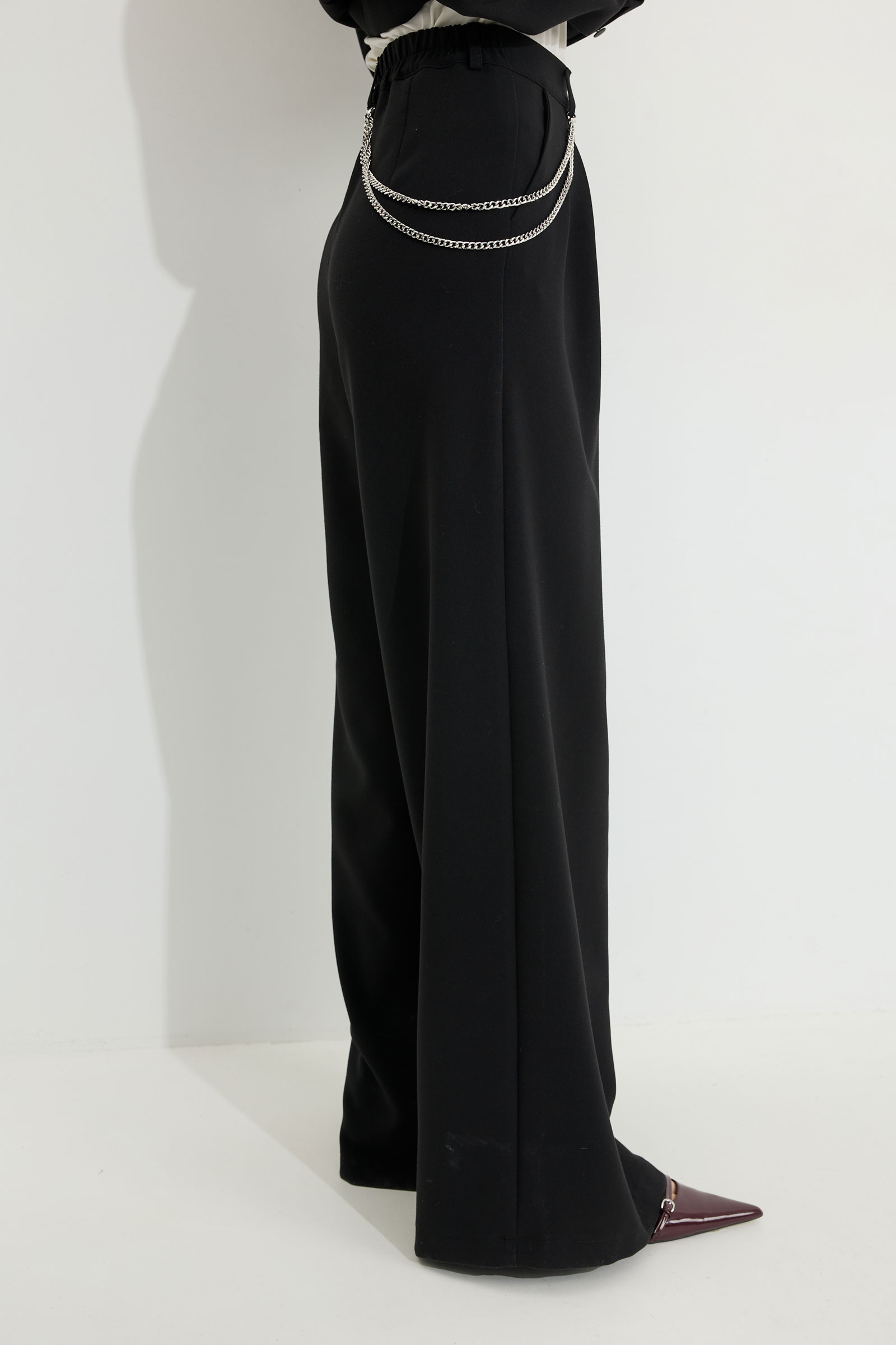 Брюки из поливискозной ткани, прямого, расширенного силуэта. На передних половинах брюк по две складки, выходящих из-под пояса, складки застрочены на несколько сантиметров. По переду застежка на молнию по типу гульфик. Брюки по переду с карманами в отрезных бочках. Пояс по переду с застежкой на петлю и пуговицу. Со шлевками по переду и спинке. По спинке в пояс вставлена резинка. На задних половинах брюк вытачки. Обращаем Ваше внимание, что фурнитура может незначительно отличаться от фото. " "Длина жакета (44-48р 48 см) (50-54р 52 см).