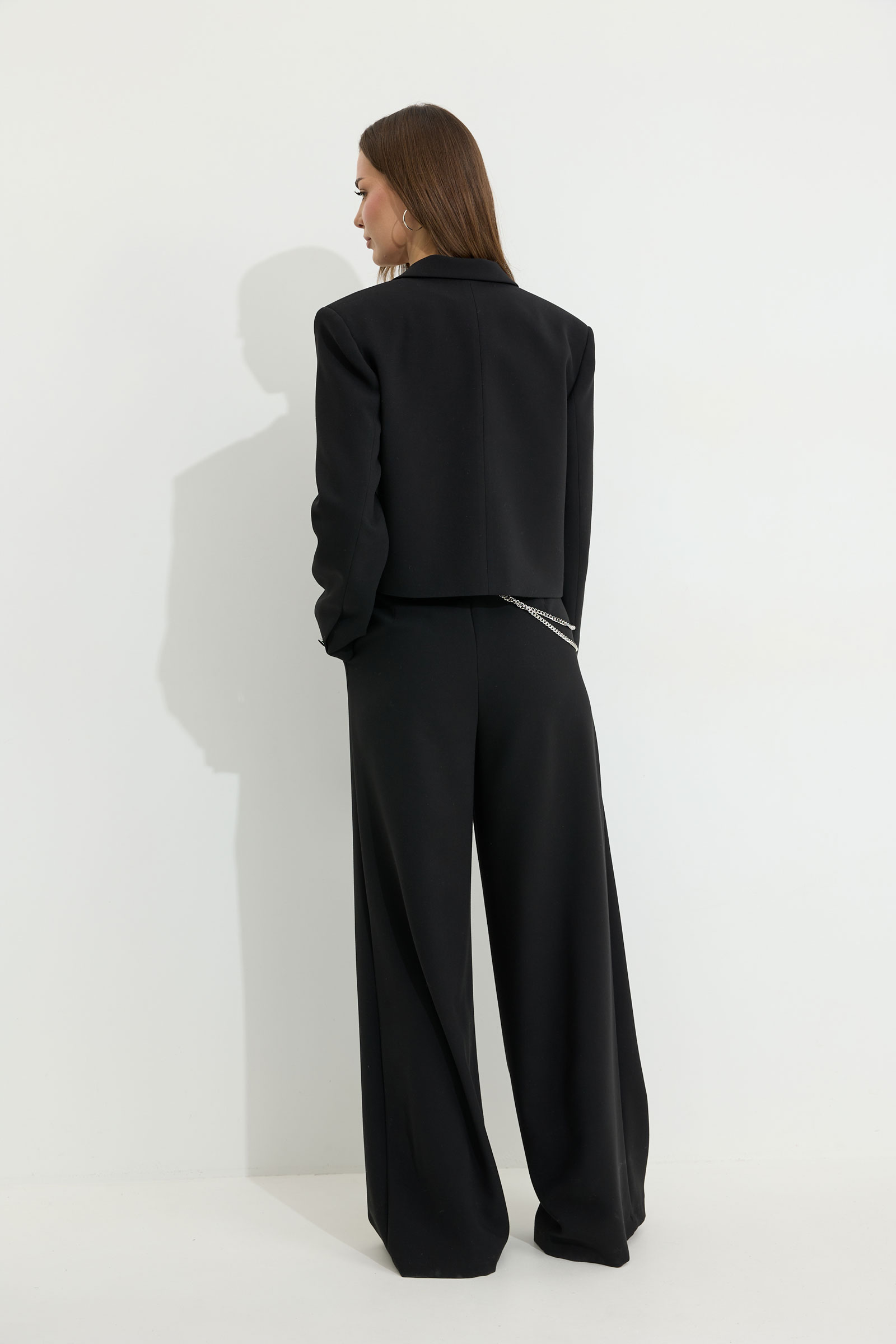Костюм 4302 (черный) 4845 44-54 "Костюм двойка, состоящи их жакета и брюк. Жакет из поливискозной ткани. Полуприлегающего силуэта, линия плеча немного расширена. Жакет укороченный. С отложным воротником и лацканами. По переду застежка на петлю и пуговицу. По переду отрезные бочки, переходящий на спинку, и талиевые вытачки, по низу горизонтальные карманы, вход оформлен листочкой. По левой полочке выше линии груди карман-обманка, вход оформлен листочкой. По спинке средний шов. Рукав длинный, двухшовный, с имитацией шлицы; шлица с застежкой на петлю и пуговицу. Жакет на подкладке. Обращаем Ваше внимание, что фурнитура может незначительно отличаться от фото.