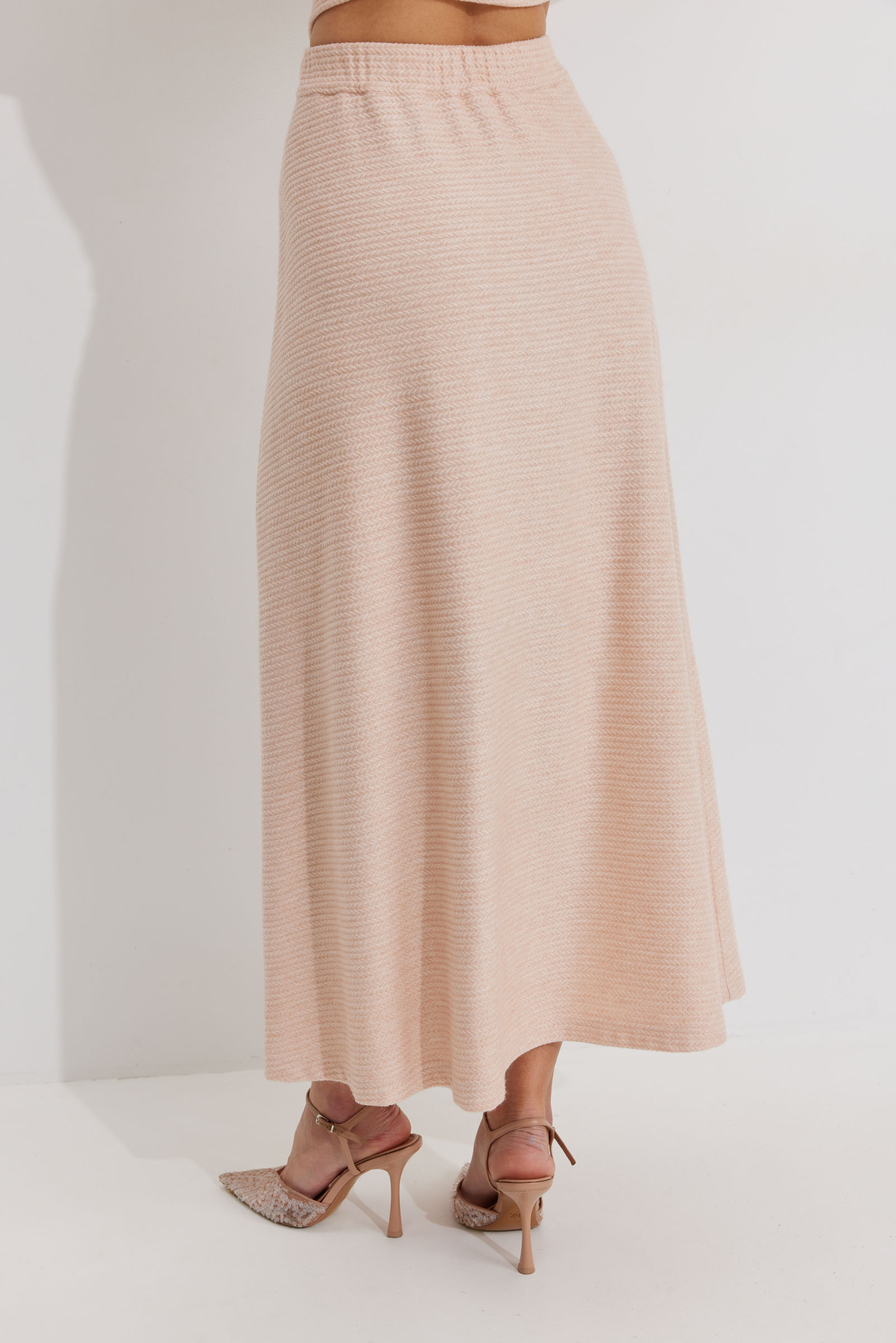 Юбка А-силуэта расширенная книзу из трикотажного полотна. По верху юбки притачной пояс с эластичной тесьмой (резинкой).