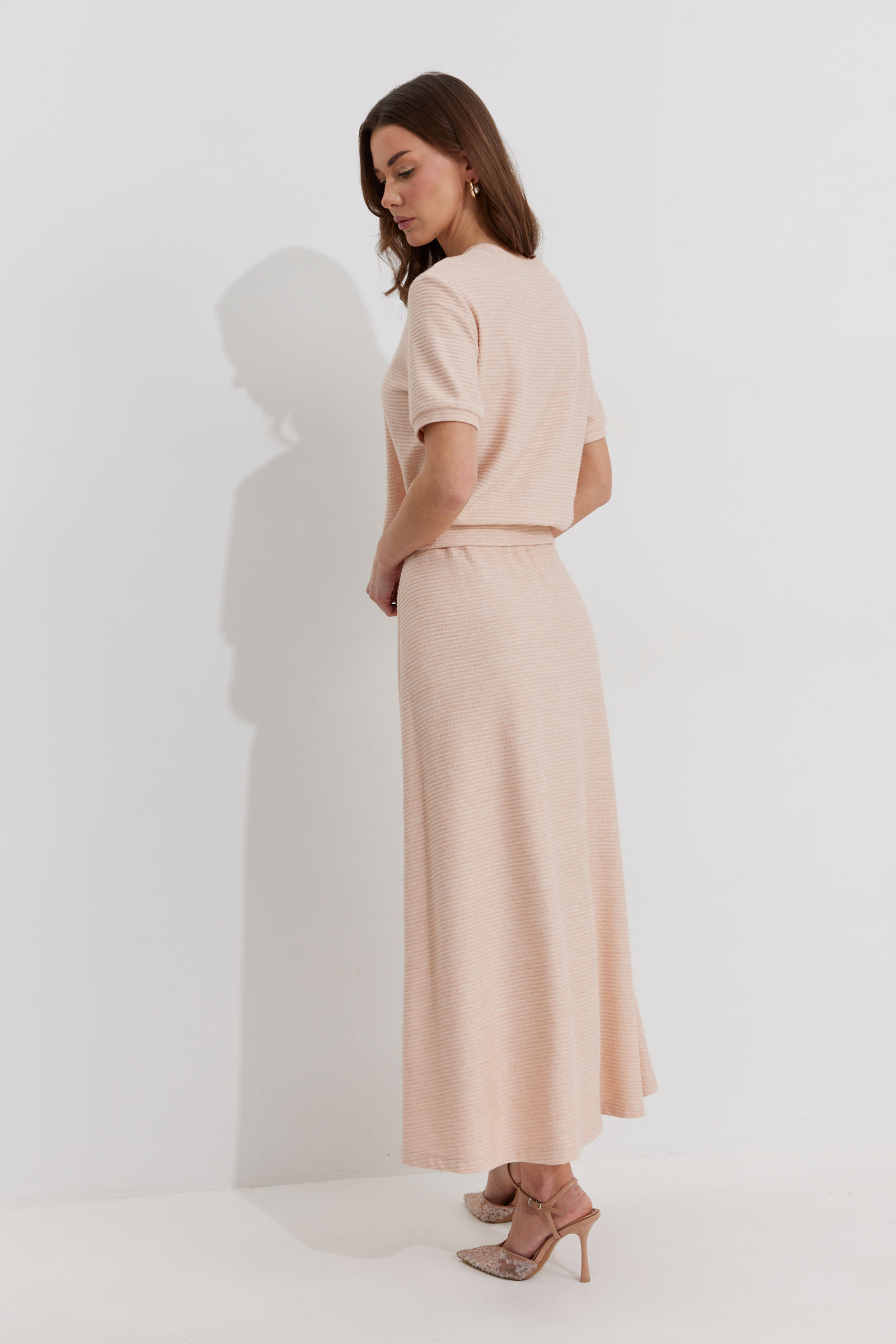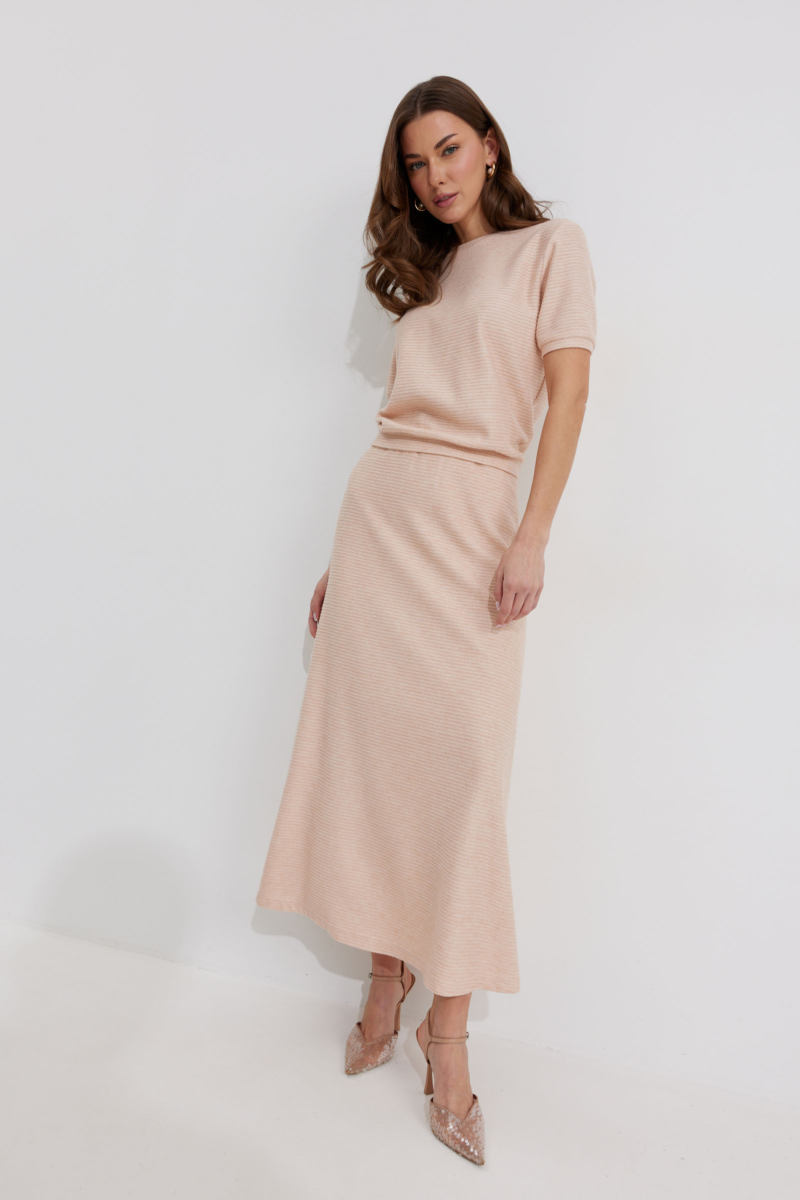 Джемпер 4312 (персик) 1870 44-54 Джемпер полуприлегающего силуэта из трикотажного полотна. Горловина округлая, рукав втачной, по низу манжета. По низу джемпера притачной пояс. "Длина джемпера (44-48р – 52см)(50-54р - 55см)