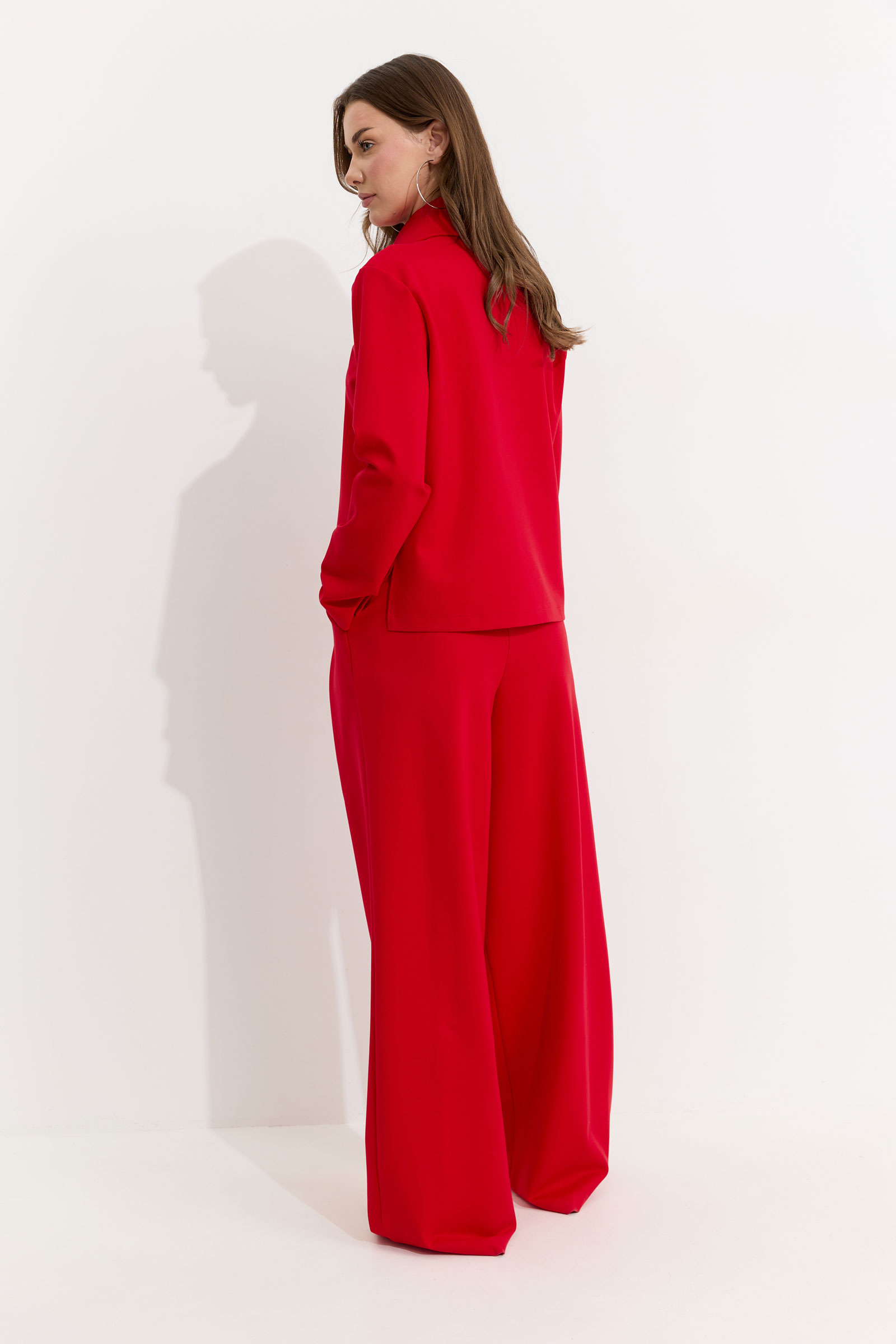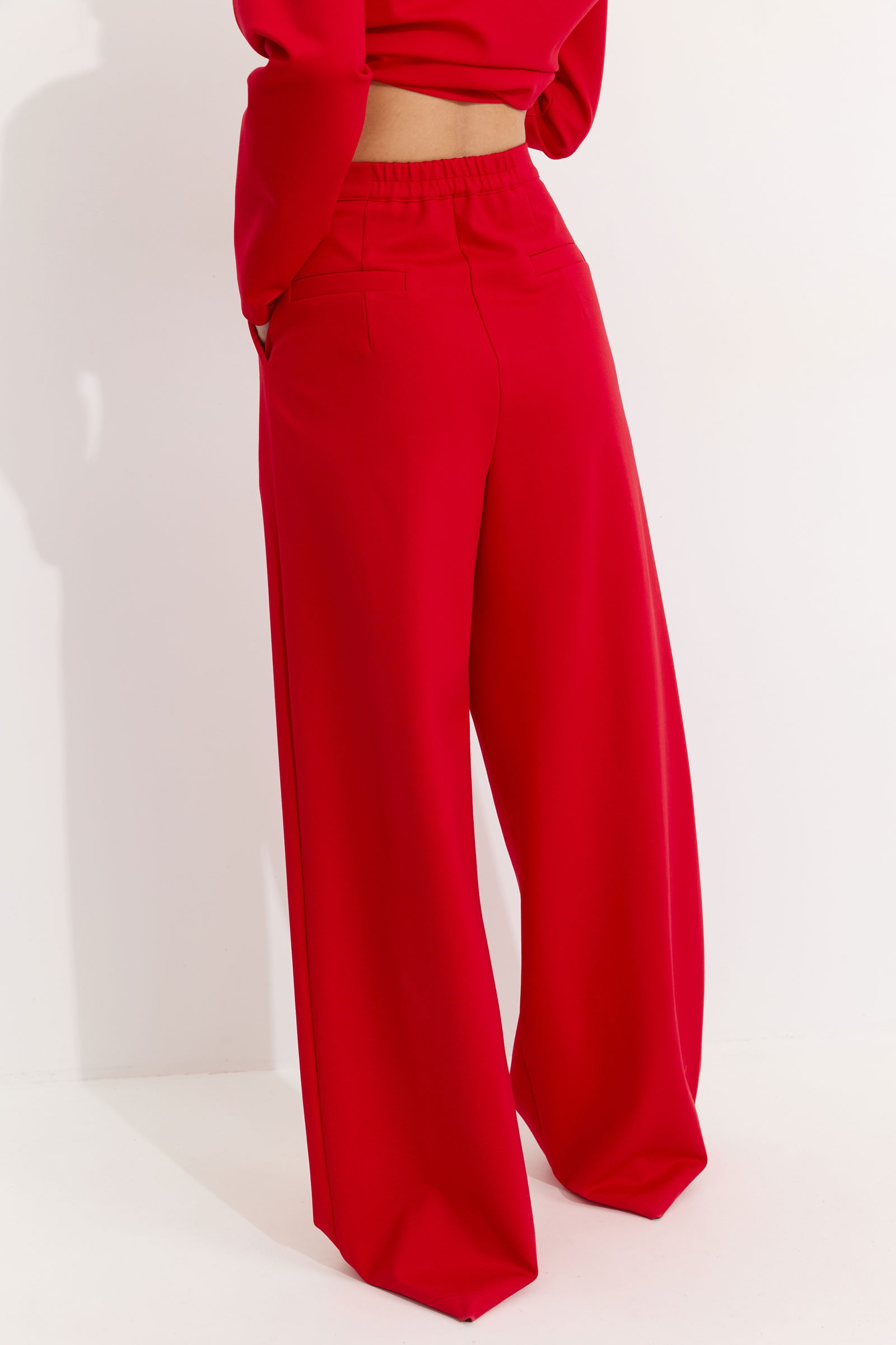 Брюки прямого силуэта из трикотажного полотна. По верху брюк притачной пояс, по переду застежка молния в среднем шве, карманы в боковых швах и декоративные складки. На задних половинках брюк прорезные листочки. По задним половинкам брюк на поясе резинка от вытачки до вытачки. Обращаем ваше внимание, что фурнитура может отличаться от фото.