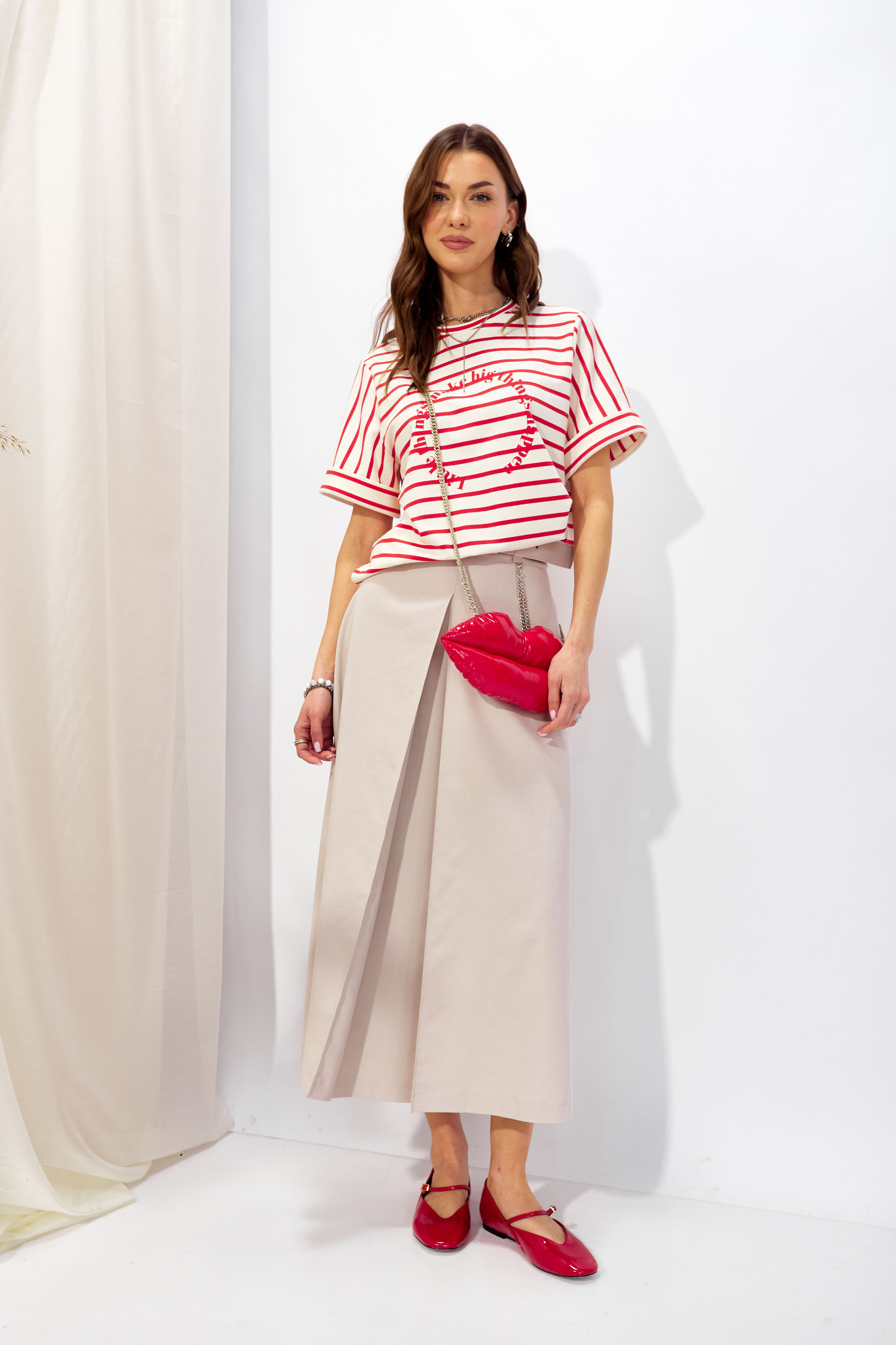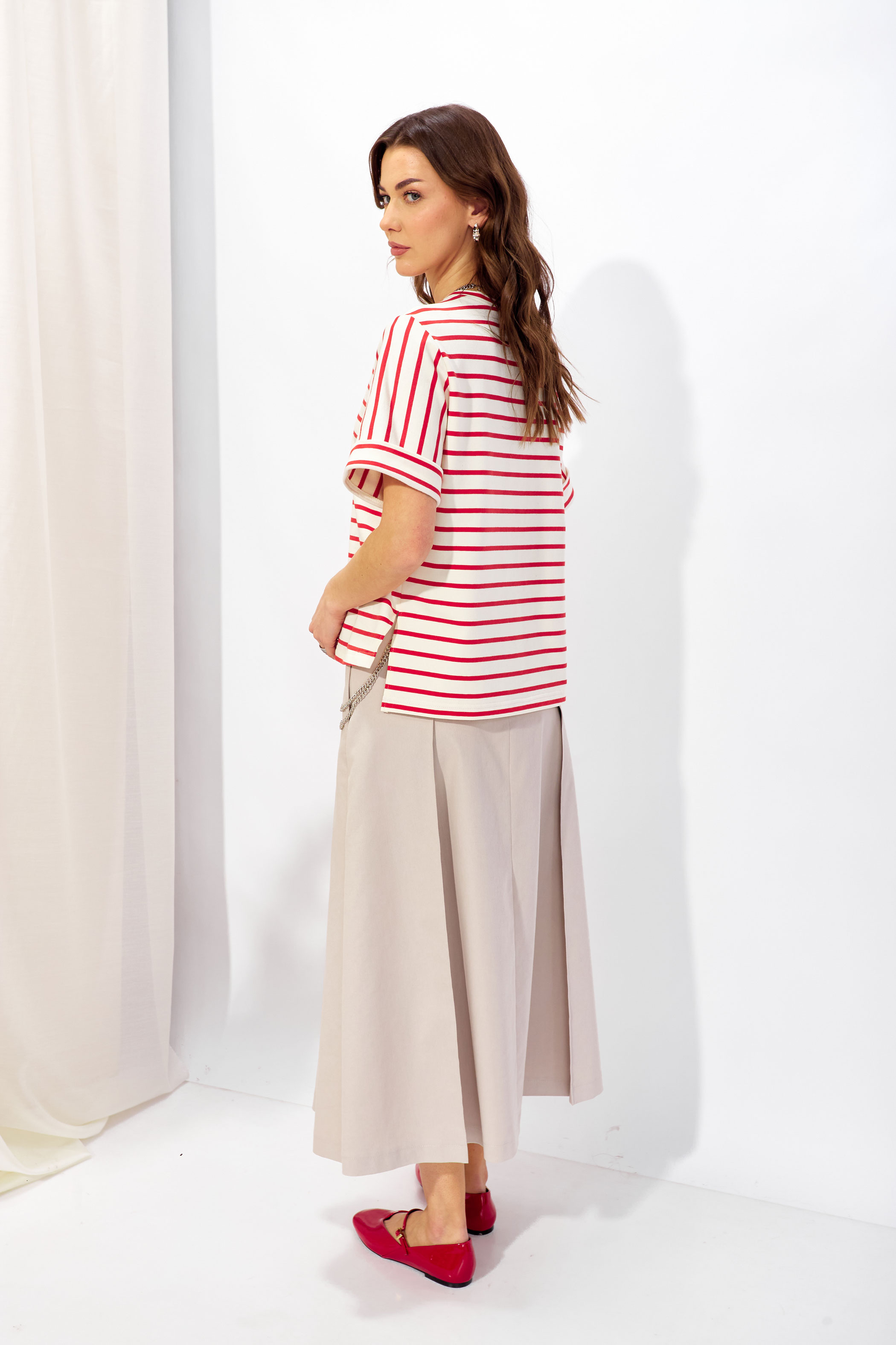 Джемпер 4334 (красный) 2430 44-60 Джемпер прямого силуэта из трикотажного полотна. Горловина округлая. Рукав втачной, по низу манжета. По бокам разрезы, спинка длиннее переда. По центру дизайнерская печать. "Длина по спинке (44-48р - 59см)(50-54р - 64см)(56-60р - 69см)