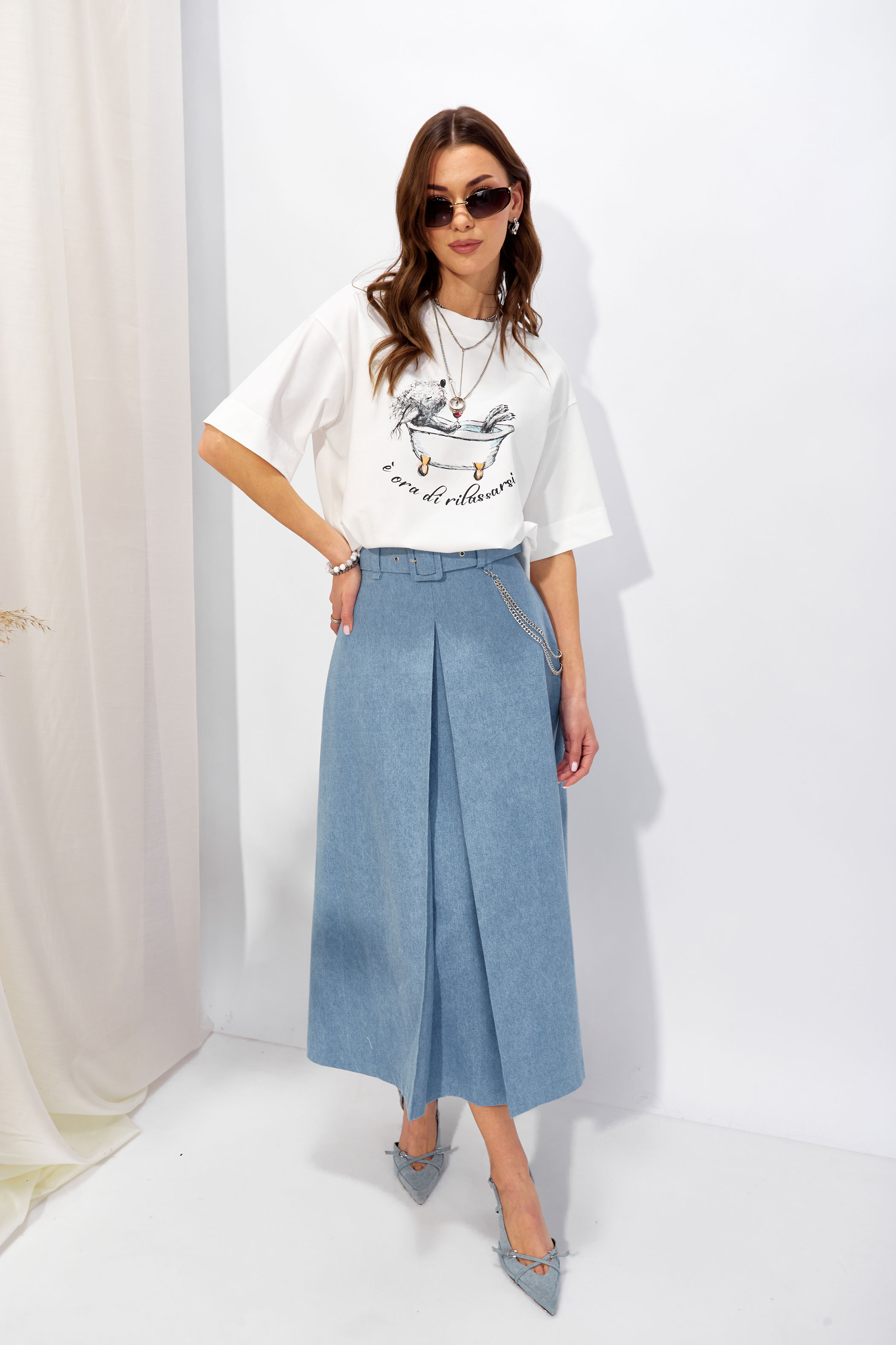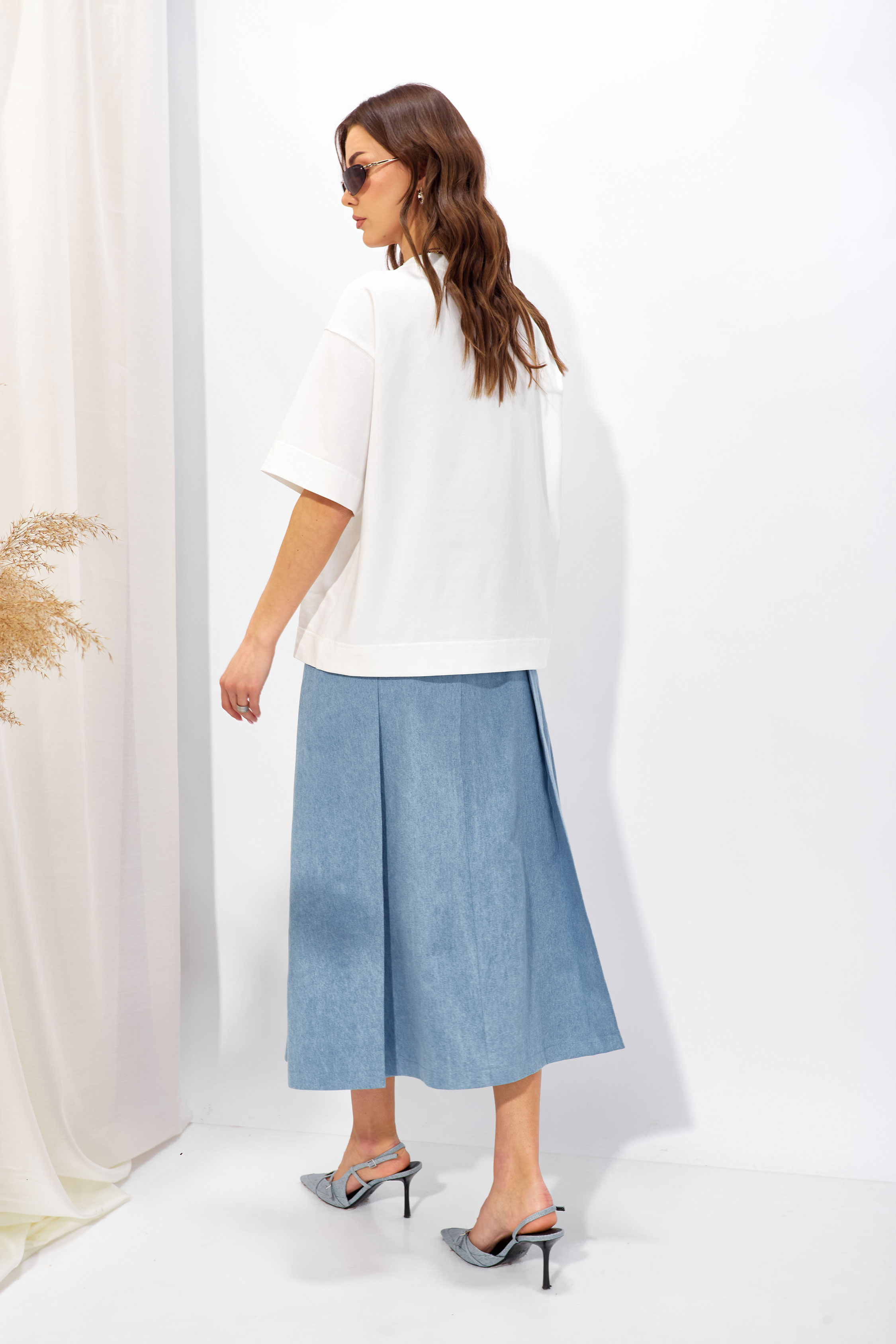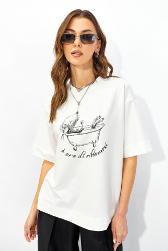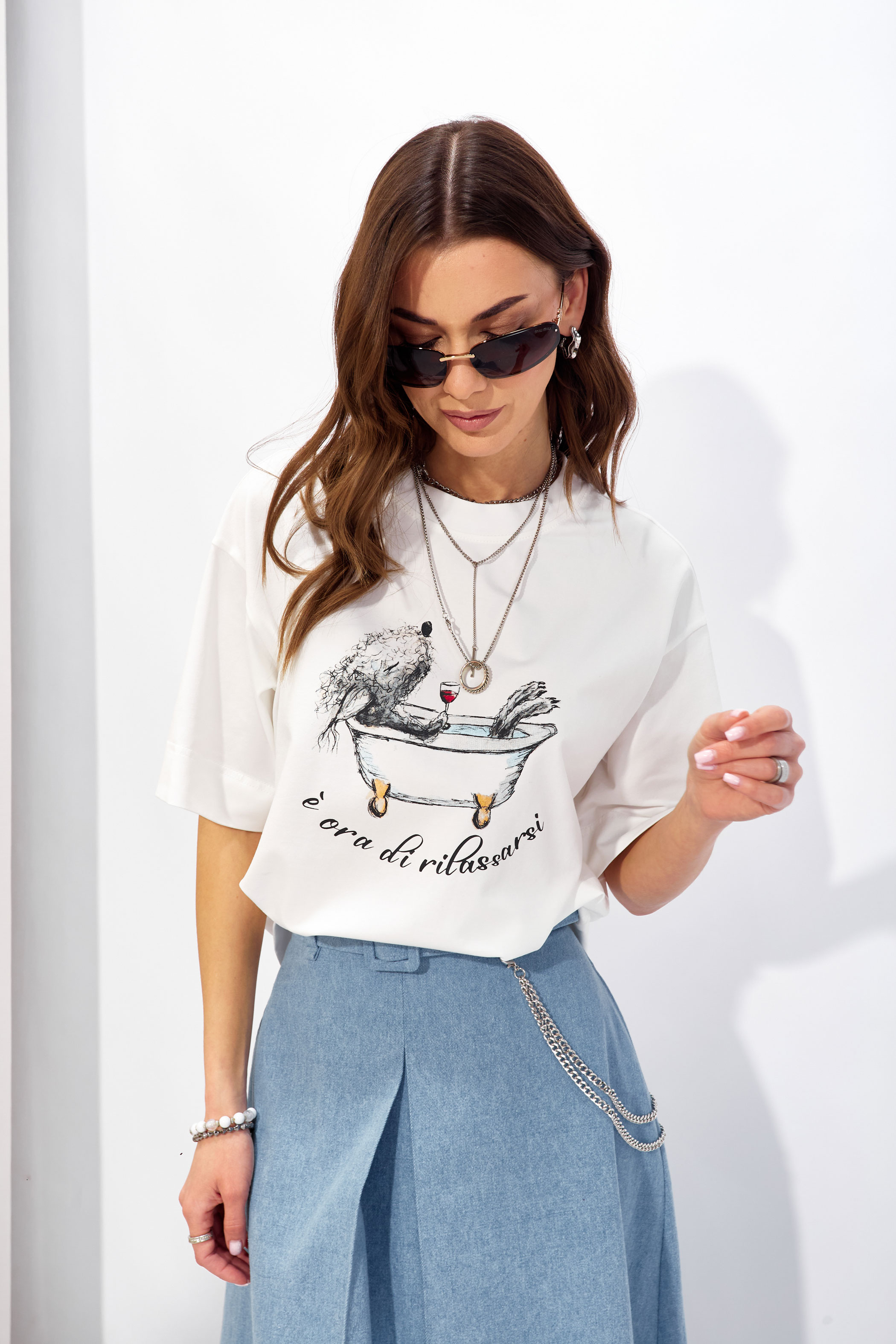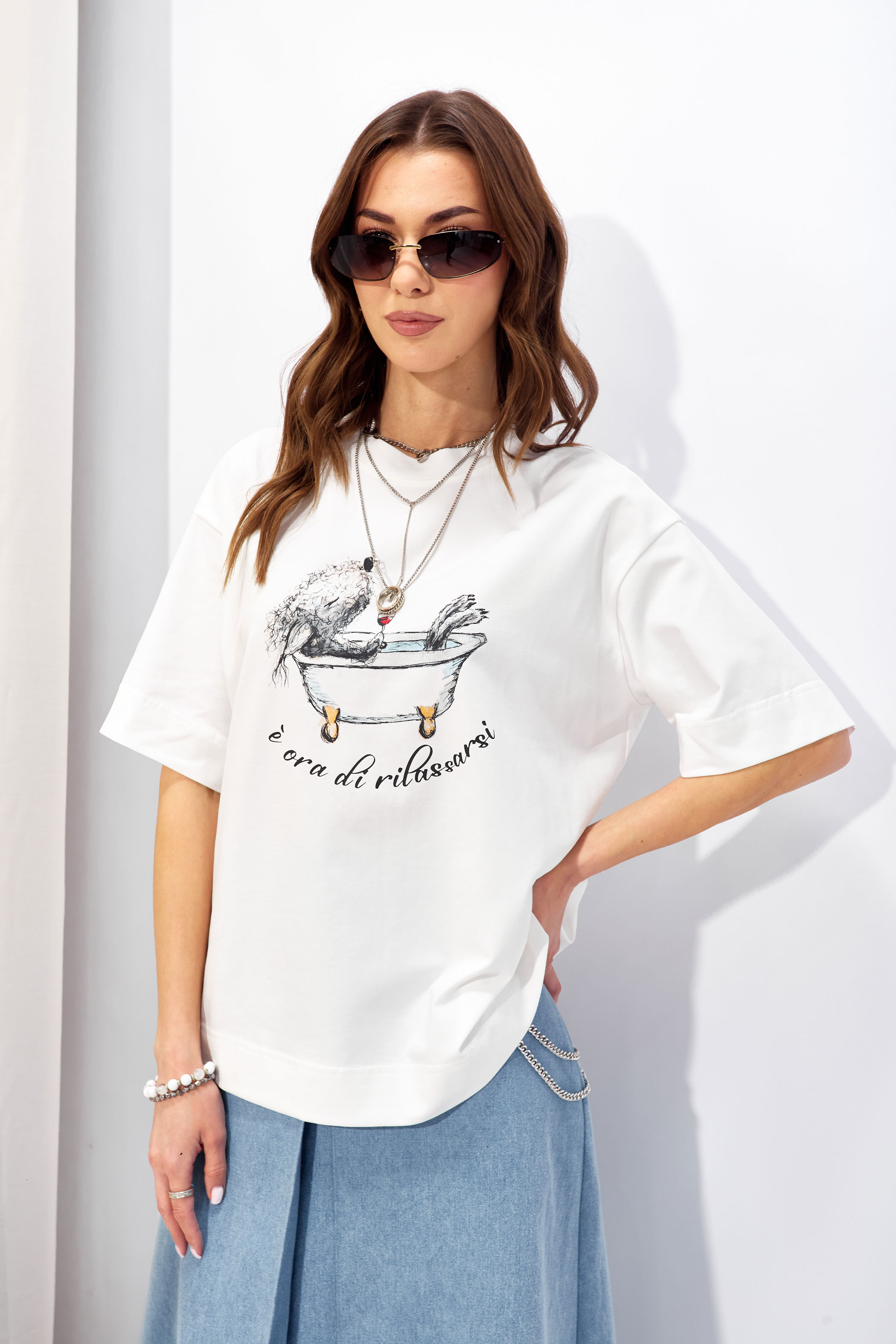 Джемпер 4341 (молоко +цвет) 2070 44-54 Джемпер прямого свободного силуэта из хлопкового трикотажного полотна. Вырез горловины округлый с притачной бейкой. Рукава втачные короткие. По переду дизайнерская печать. "Длина джемпера (44-48р – 61см)(50-54р - 63см)
