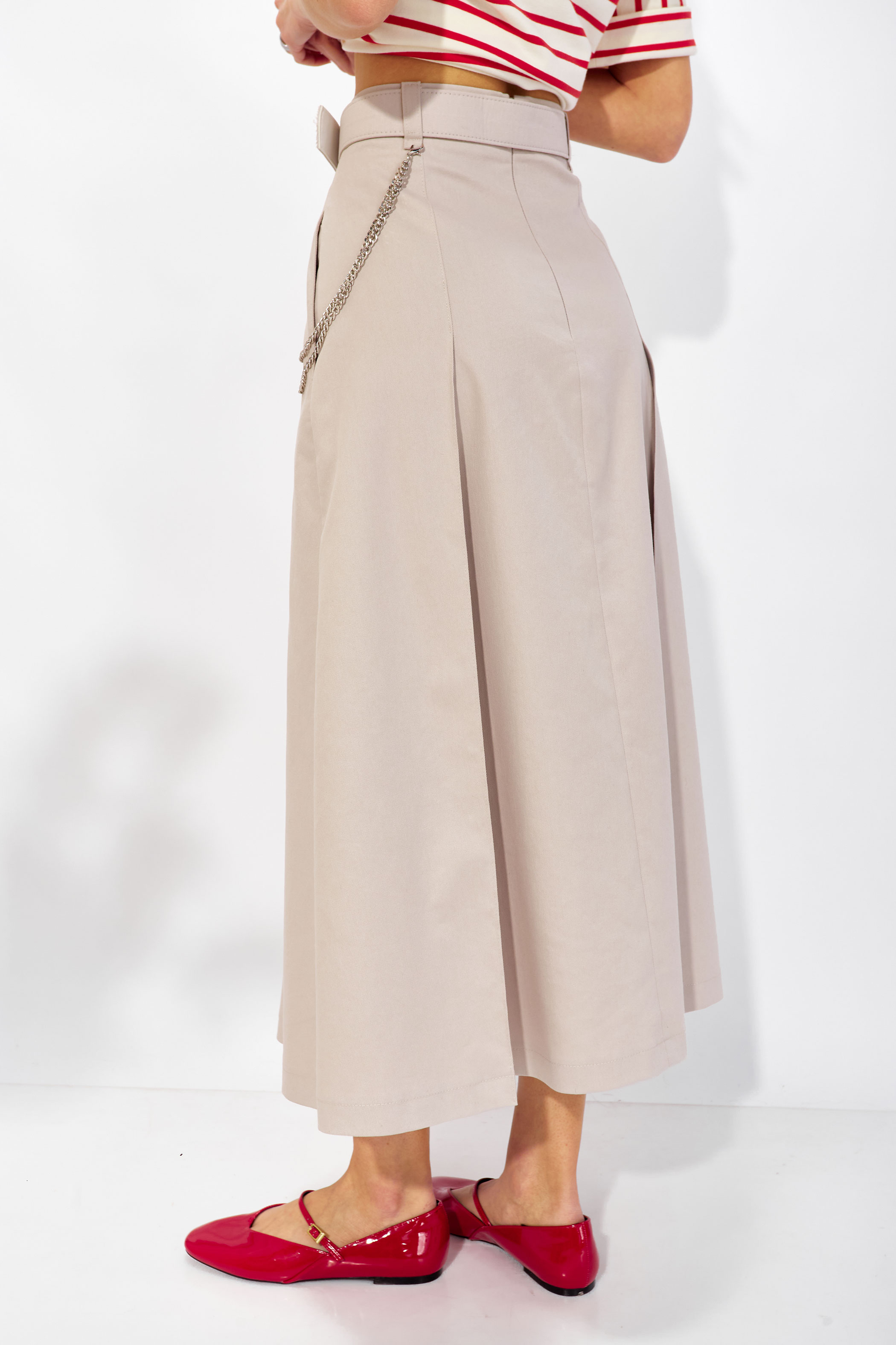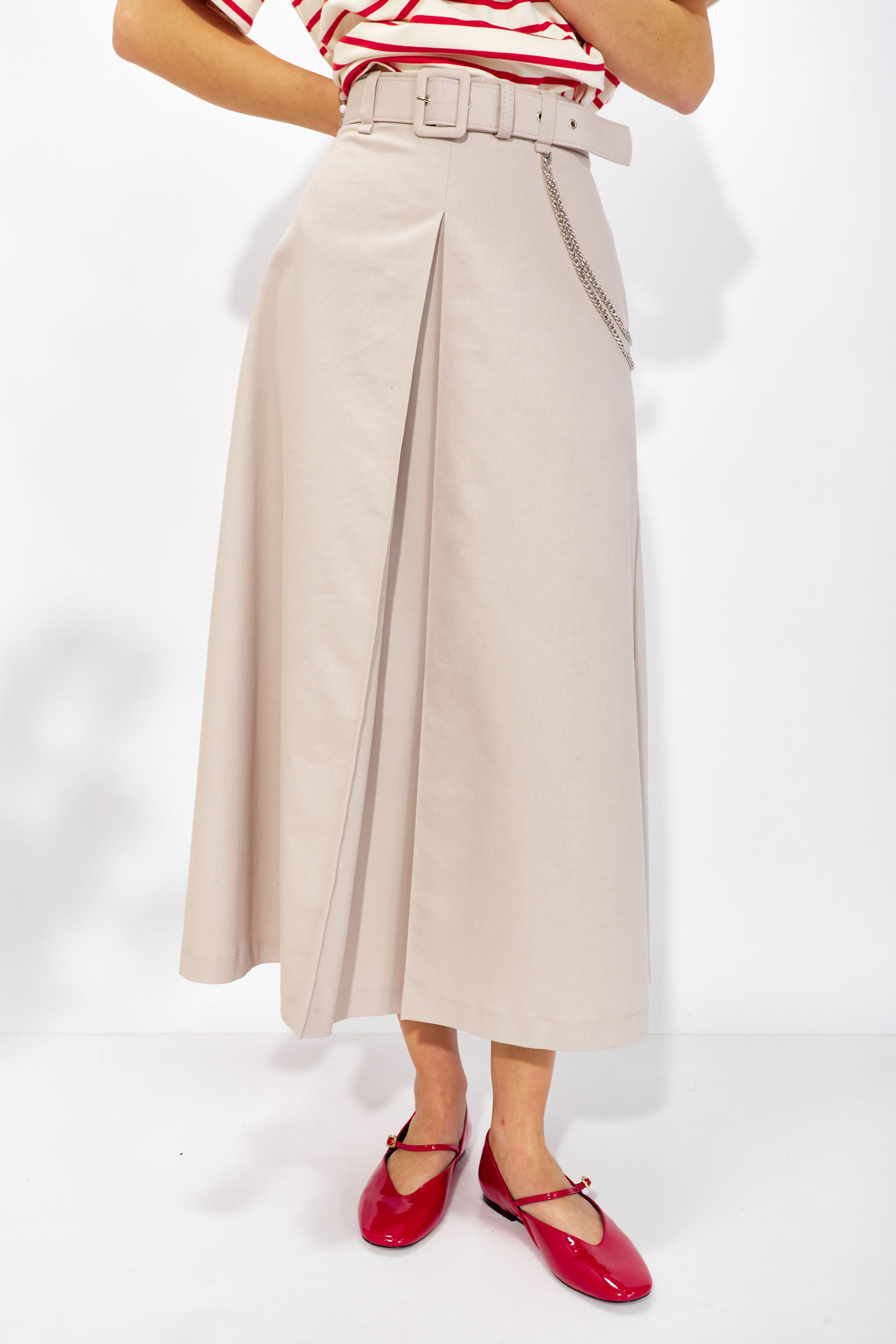 Юбка 4363 (песок) 2790 44-54 Юбка расширенная книзу из джинсовой ткани. По верху юбки притачной пояс со шлевками для ремня, на спинке застежка на потайную молнию. По переду и спинке складки. В боковых швах карманы. На спинке в среднем шве потайная молния. В комплект входит съемный ремень. Обращаем ваше внимание, что фурнитура может отличаться от фото. Длина юбки (85см +4,5см пояс )