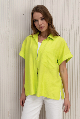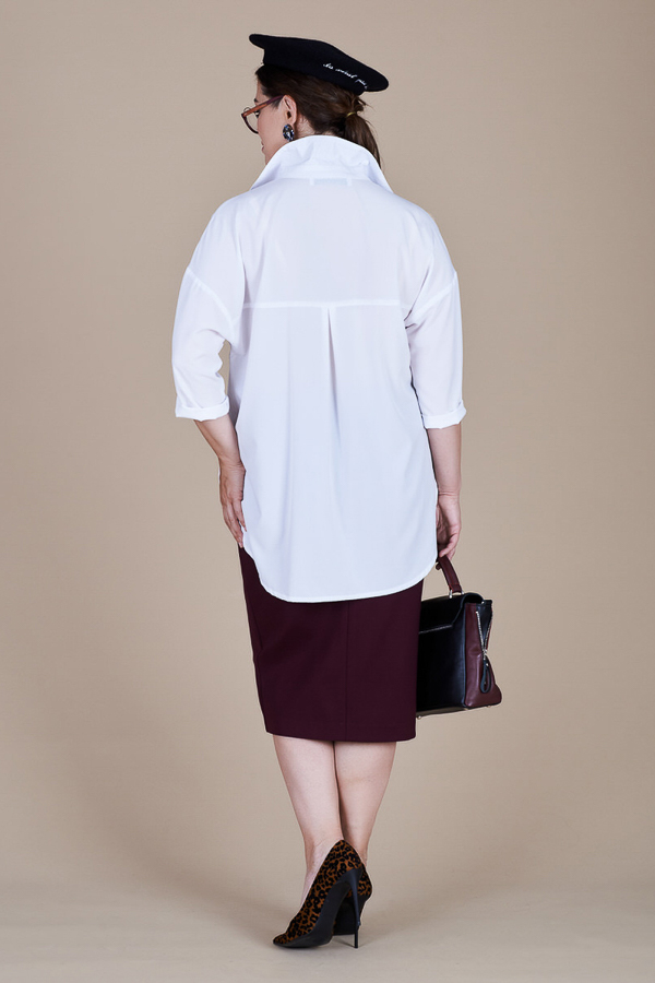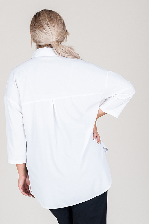 Модная блуза-туника из блузочной ткани очень свободного силуэта с застёжкой на планке. Низ изделия асимметричной длины (спинка удлинена относительно переда) с закруглениями по бокам. Рубашечный рукав ¾. Круглый вырез горловины обработан отложным воротником на стойке. На задней части изделия выполнена кокетка с небольшой бантовой складкой. На передней-накладные карманы в области груди. Жемчужные пуговицы на застёжке придают изделию нарядный вид. Достоинство этой модели - в способности скрыть некоторые недостатки фигуры. Её можно сочетать как с брюками, так и с джинсами.