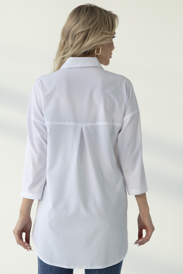 Модная блуза-туника из блузочной ткани очень свободного силуэта с застёжкой на планке. Низ изделия асимметричной длины (спинка удлинена относительно переда) с закруглениями по бокам. Рубашечный рукав ¾. Круглый вырез горловины обработан отложным воротником на стойке. На задней части изделия выполнена кокетка с небольшой бантовой складкой. На передней-накладные карманы в области груди. Жемчужные пуговицы на застёжке придают изделию нарядный вид. Достоинство этой модели - в способности скрыть некоторые недостатки фигуры. Её можно сочетать как с брюками, так и с джинсами.