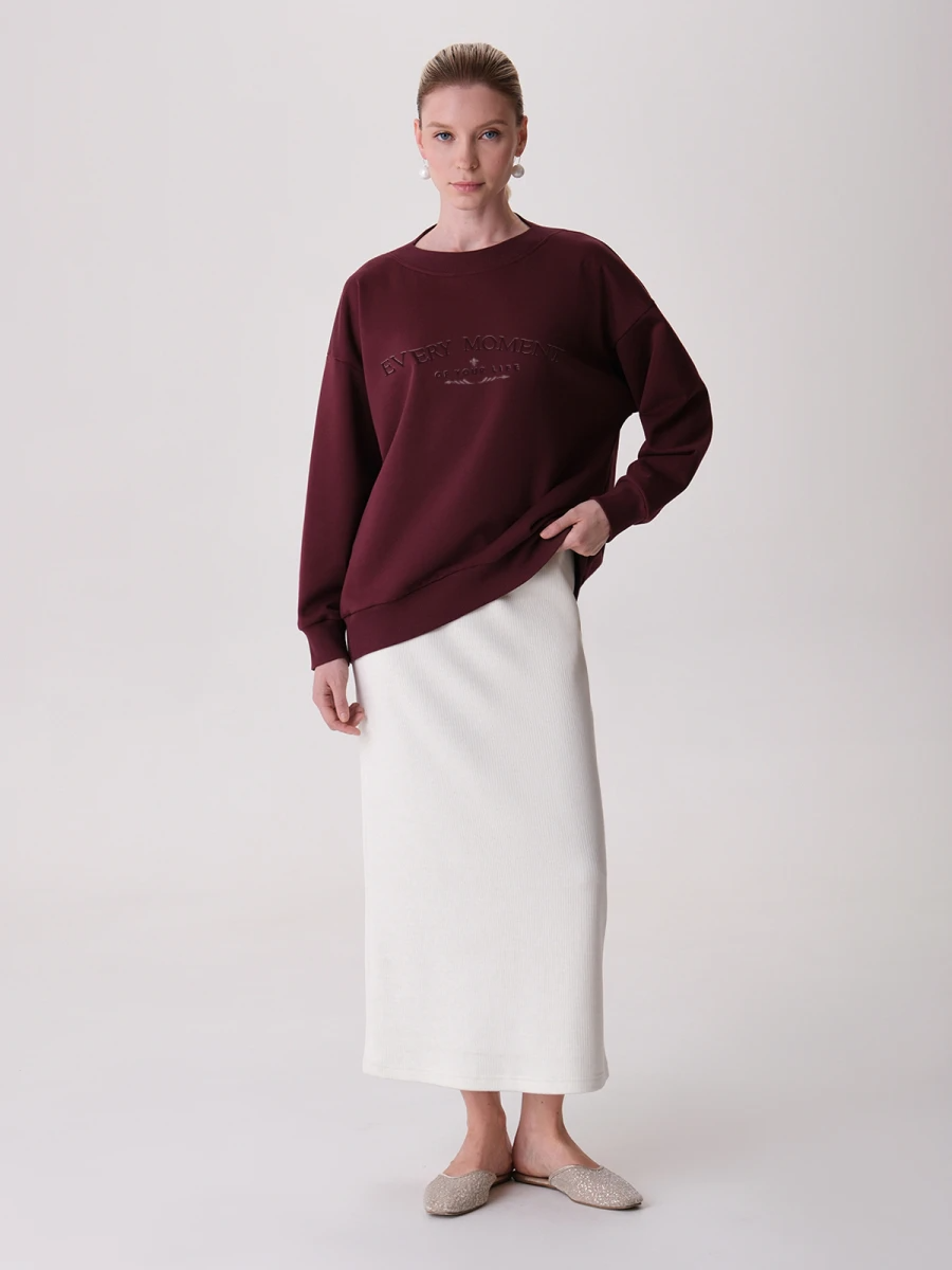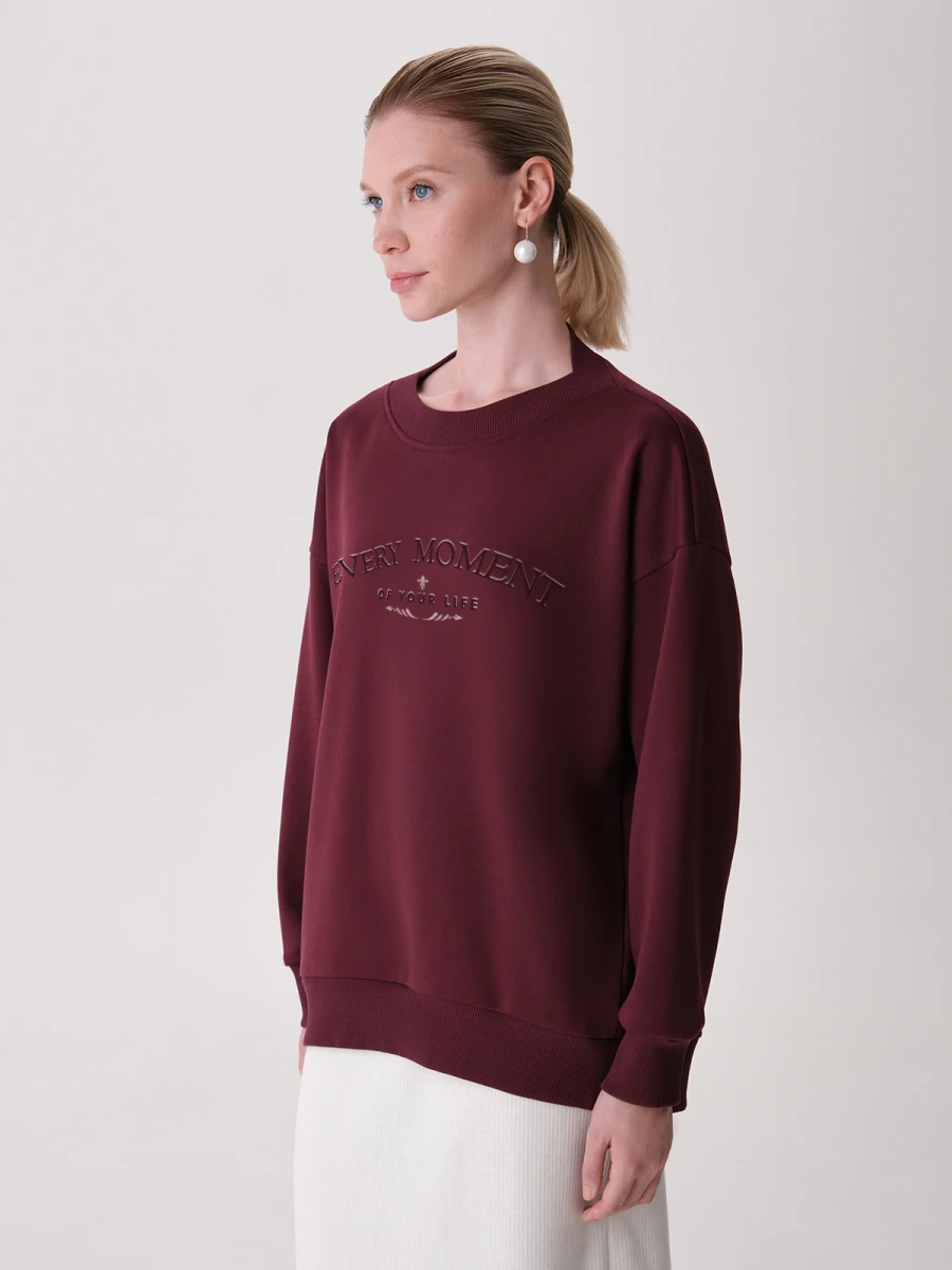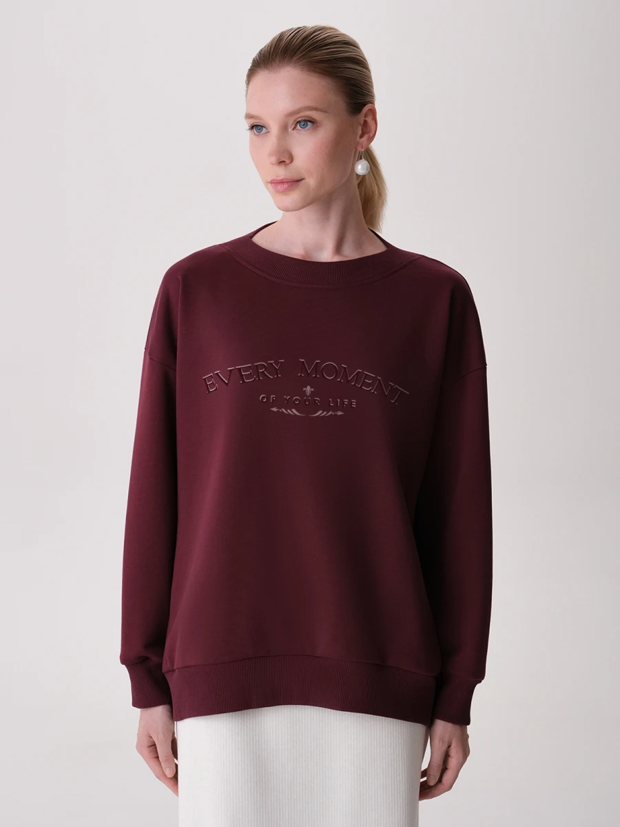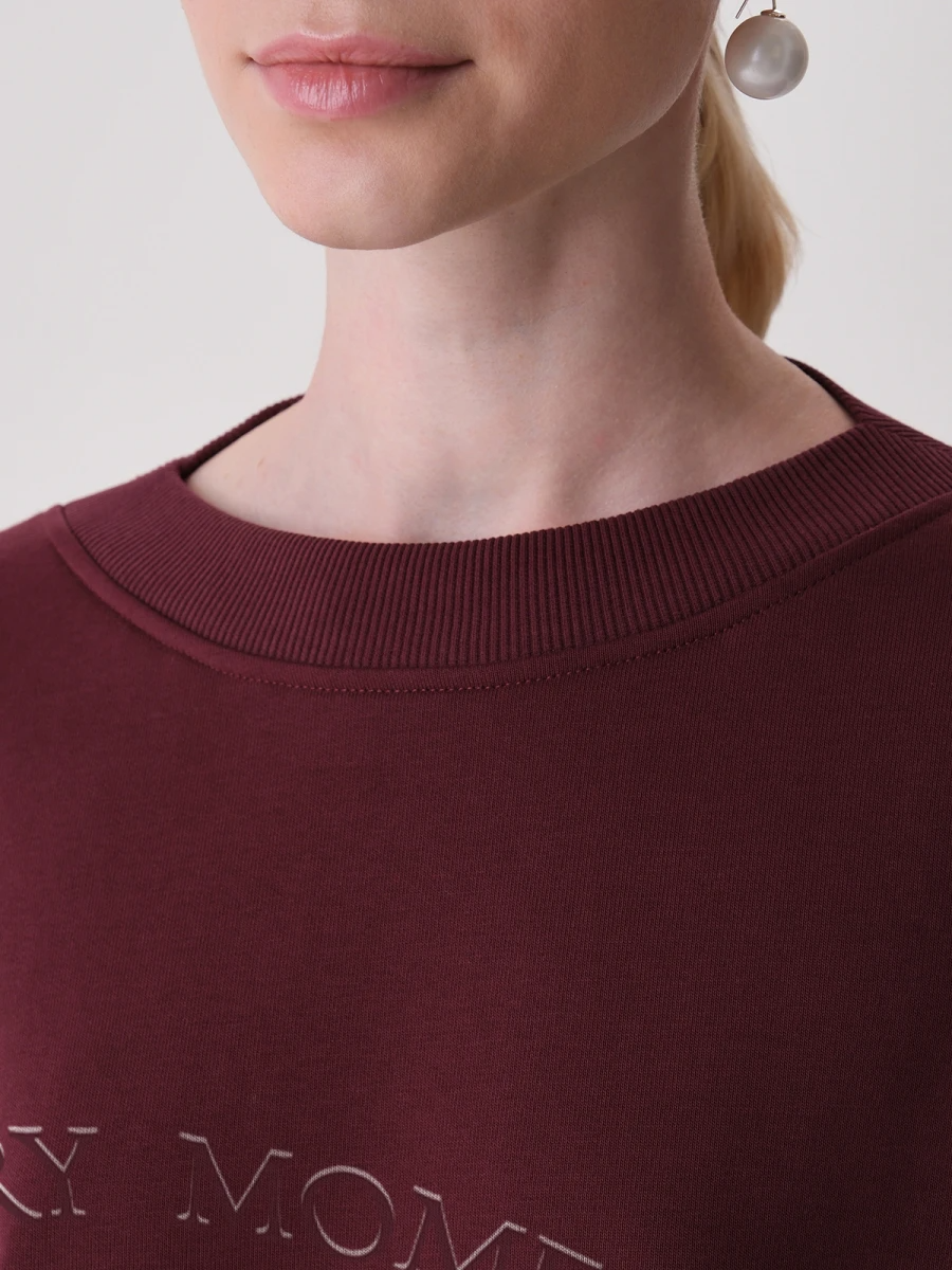 Базовый oversize свитшот в глубоком оттенке марсала подчеркнет индивидуальный стиль и яркий характер. Модель из мягкого эластичного трикотажа премиального качества станет отличным вариантом для комфортных теплых образов. Актуальный вырез горловины «лодочка» демонстрирует линию ключиц, а низ изделия и манжеты оформлены эластичными вставками. Спереди расположен минималистичный принт.