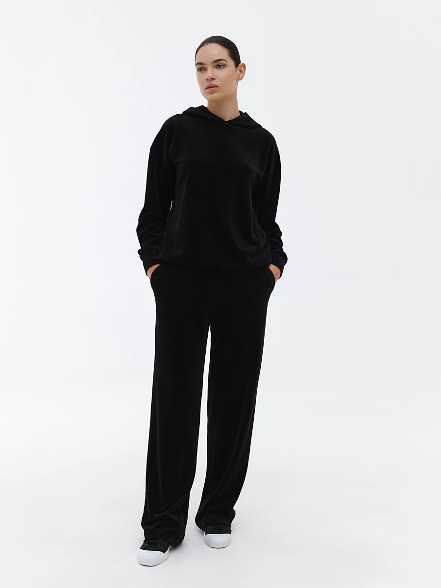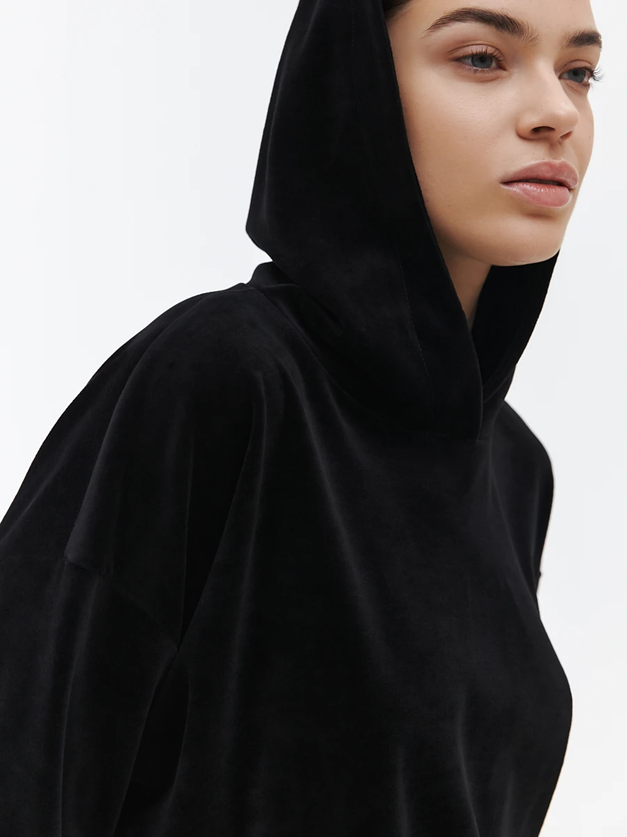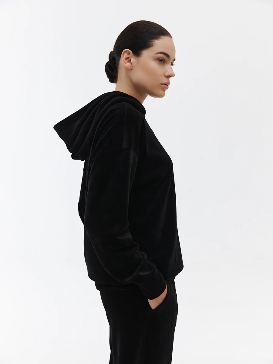 Нет более комфортной и практичной вещи в повседневном гардеробе, чем свободное худи из мягкого трикотажа. Модель в черном цвете выполнена из высококачественного велюра, приятного к телу. Длинные рукава оснащены манжетами на резинке, как и низ изделия. Также имеется большой капюшон, благодаря которому можно еще больше укрыться от наступающих холодов и навязчивого ветра.