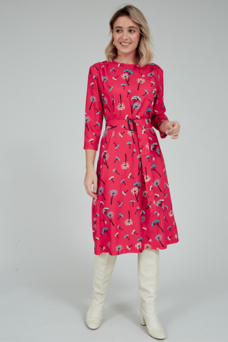Платье из креповой ткани полуприлегающего силуэта, расширенное книзу. На передней части изделия выполнены кокетки с женственной сборкой. По среднему шву спинки застёжка на петлю-пуговицу. Круглый вырез горловины обработан косой бейкой. Рукав втачной ¾. В комплекте пояс из основной ткани.