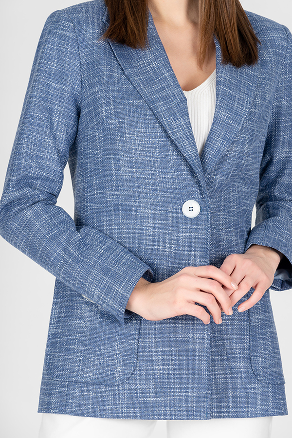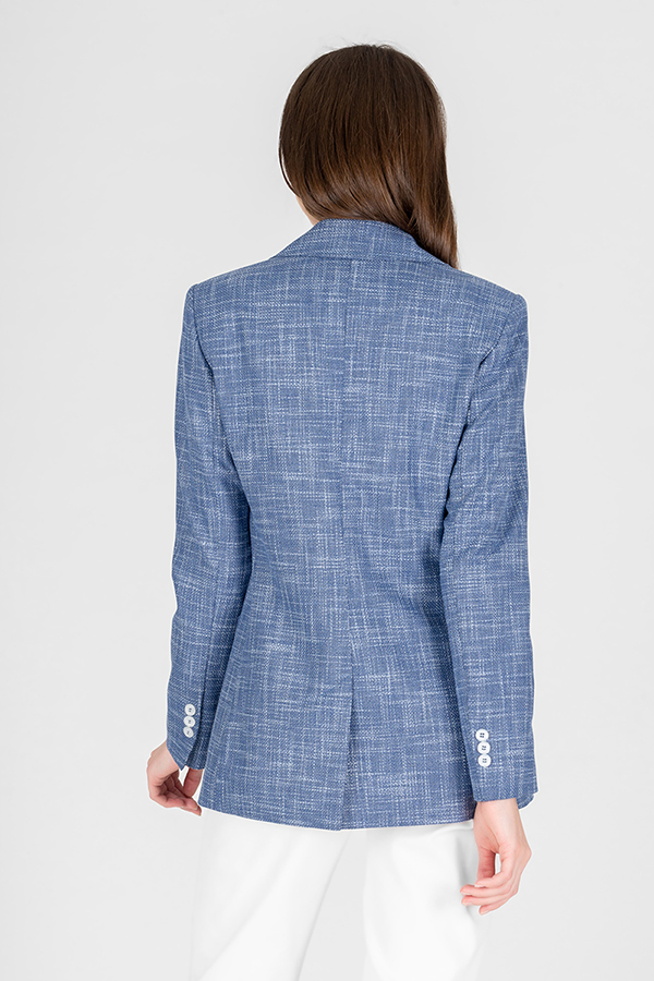 Элегантный жакет из роскошной костюмной ткани в стиле CHANEL. Полуприлегающий силуэт с английским воротником, который визуально сделает фигуру стройнее и подчеркнет красивую линию груди. На передней части жакета застежка на пуговицу и накладные карманы. По центру задней части выполнена шлица - элемент декоративный и необходимый. Обеспечивает свободу движения, добавляет шику и элегантности. Втачной длинный рукав, снизу шлица с контрастными пуговицами. Изделие идеально держит форму, имеет четкую линию плеча благодаря плечевым накладкам. Жакет на подкладке небесно-голубого цвета.