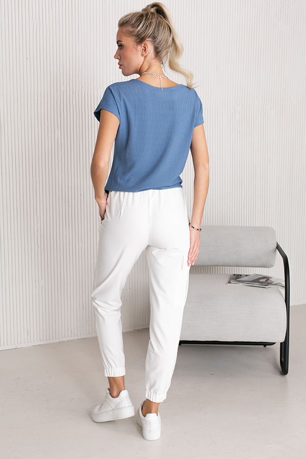 Брюки из костюмной ткани, чуть зауженные книзу. В боковых швах выполнены карманы с подкройным бочком и клапанами. Пояс с эластичной резиной. На передней части брюк имитация гульфика, на бедре-оригинальный карман с клапаном. Низ брюк на резинке.