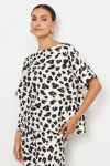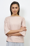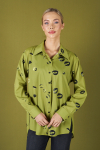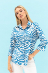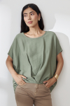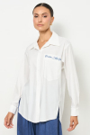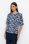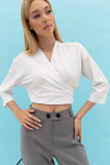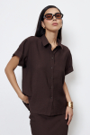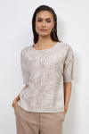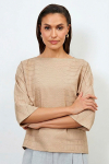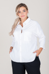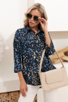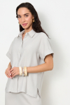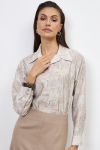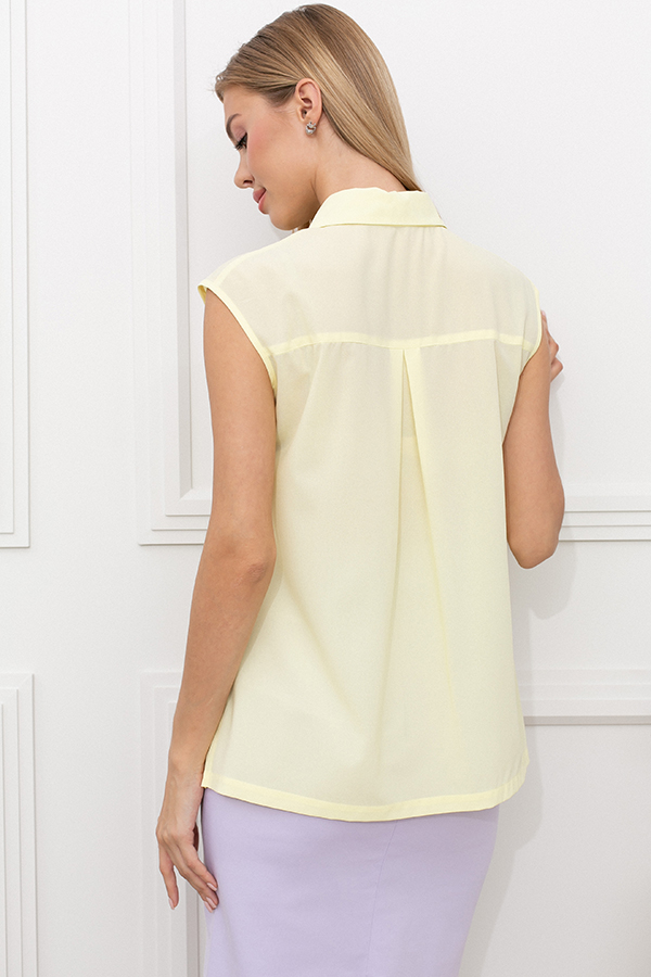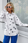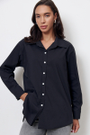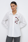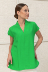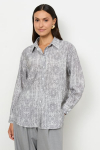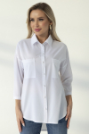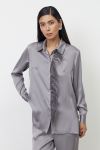 Блуза свободного силуэта с разрезами в боковых швах из креповой блузочной ткани. Лиф с застёжкой на пуговицы. Вырез горловины обработан отложным воротником на стойке. На задней части изделия выполнена кокетка с небольшой складкой. Линия проймы окантована косой бейкой из основной ткани. Жемчужные пуговицы на застёжке придают изделию нарядный вид.