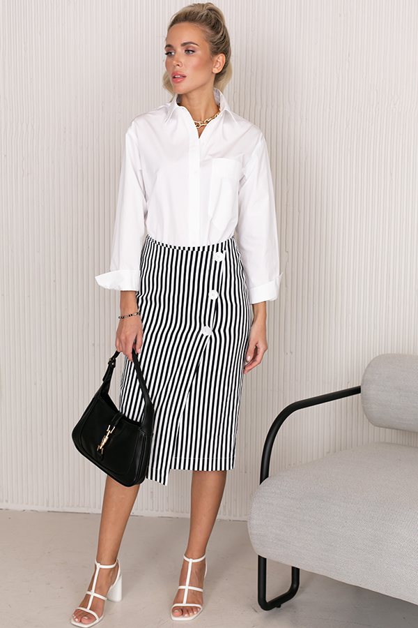 Юбка прямого силуэта из хлопковой ткани. Изделие с запахом, зафиксированным в области талии и декоративными пуговицами. Сзади по среднему шву застёжка-молния. Изделие без пояса, верхний срез обработан обтачкой.