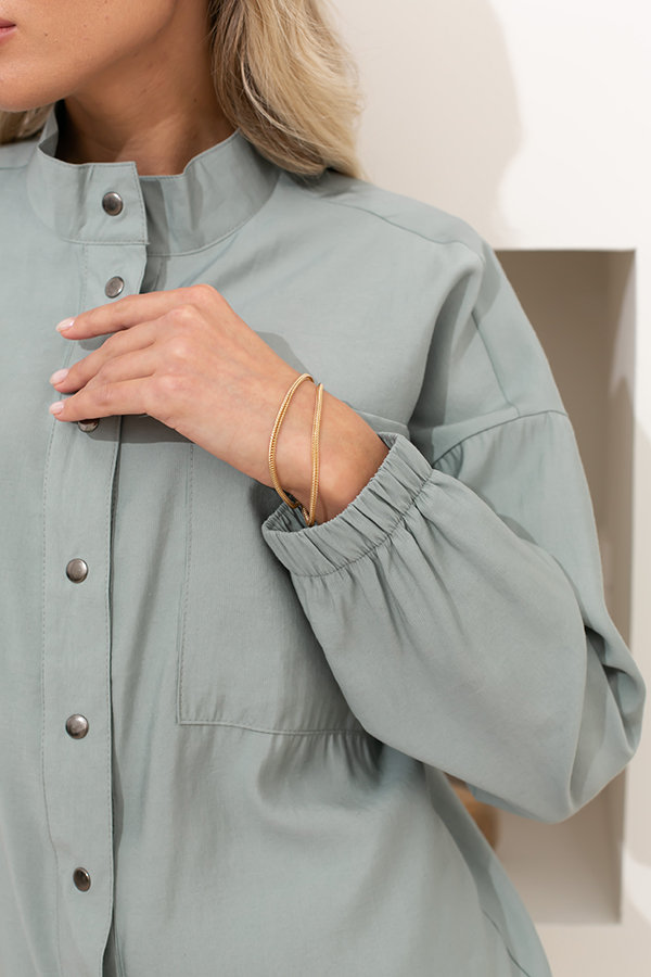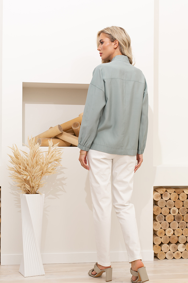 Жакет свободного силуэта из легкой костюмной ткани. По центру передней части изделия застёжка на кнопки и накладные карманы. На задней части выполнена кокетка. Втачной рукав в спущенную пройму. Нижняя часть рукава присборена на резинку. Линия горловины оформлена воротником-стойкой.