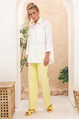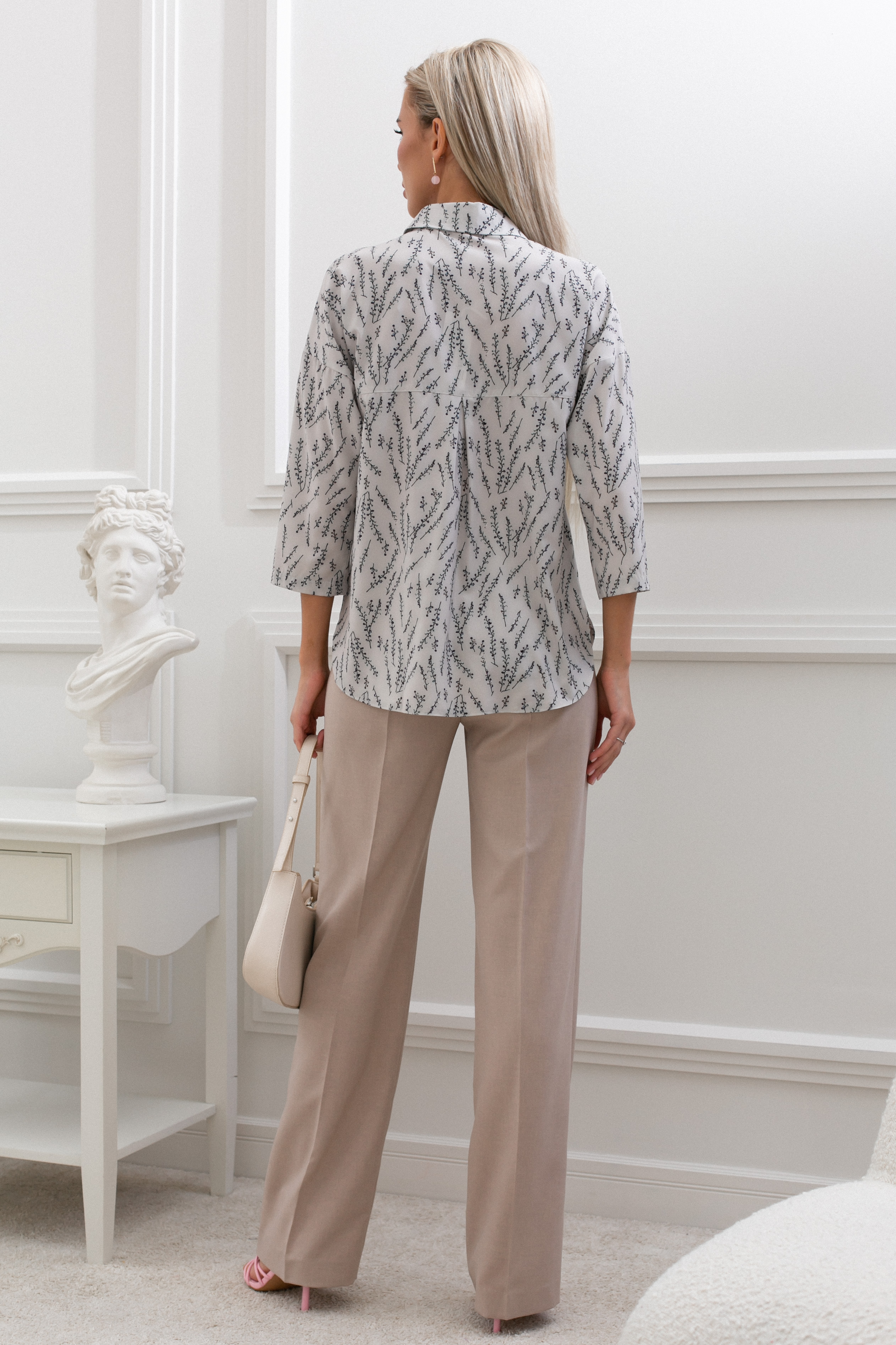 Брюки прямого силуэта из лёгкой костюмной ткани. На передней части брюк имитация гульфика. На задней части брюк выполнены накладные карманы. Пояс притачной с эластичной резиной.
