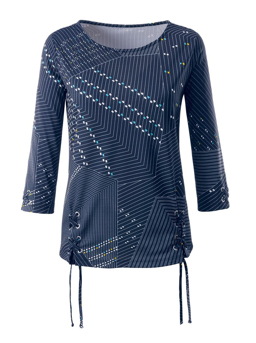 Благодаря графическому узору сзади и спереди кофта притягивает взгляды. Свободный крой за счет рукавов 3/4 и разрезов по бокам, который дополняют блочки и шнуровка. С закругленным низом.