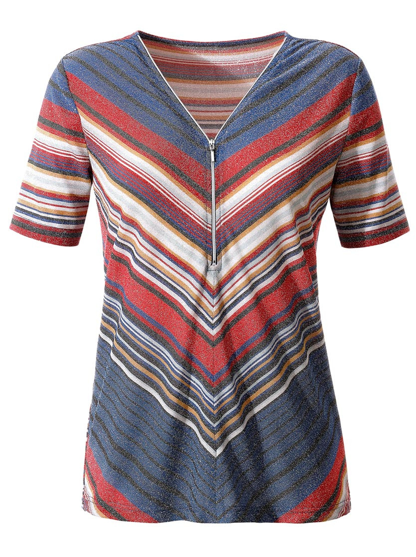 та актуальная модель выгодно подчеркнет вашу фигуру благодаря свободному покрою и придающему стройность полосатому узору спереди! Кофта с V-образным вырезом, переходящим в застежку-молнию. С блестящей фасонной пряжей.