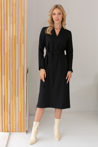 Платье свободного силуэта из плательной ткани. По центру передней части изделия выполнен шов. Цельнокроеная стойка, переходящая в V-образный вырез горловины, визуально делает фигуру стройнее. Втачной длинный рукав с центральным швом и декоративным разрезом по низу рукава. Пояс в комплекте.