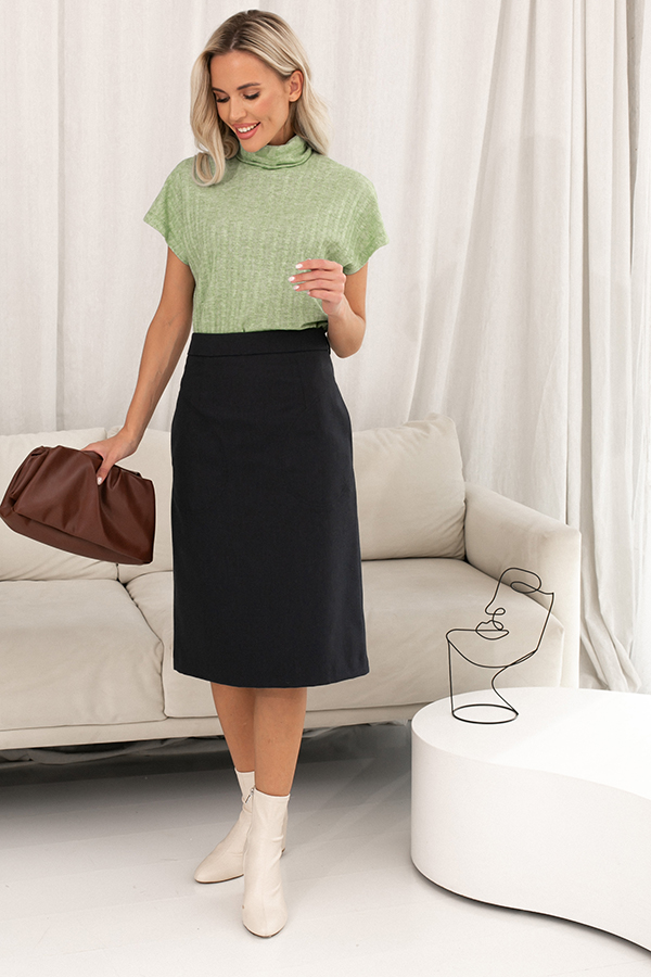 Юбка прямого силуэта, расширенная книзу из костюмной ткани. В боковых швах выполнены карманы с отделочной строчкой по контуру. Сзади по среднему шву застёжка-молния. Пояс притачной со шлёвками.