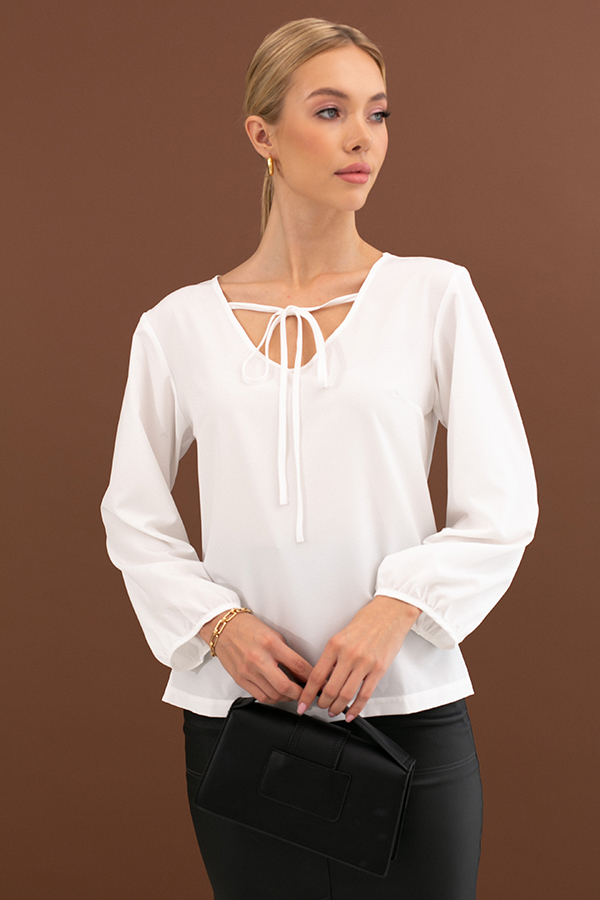 Блуза свободного силуэта из блузочной ткани. Рукав втачной, снизу присборен и окантован бейкой. V-образный вырез горловины с декоративной завязкой.