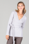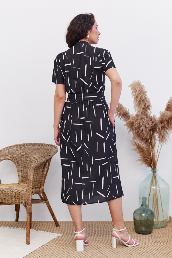 Платье свободного силуэта из плательной ткани. Изделие отрезное по линии талии с резинкой. Лиф платья с запахом, фиксируется на пуговицу для удобства. На передней части юбки выполнена складка, имитирующая запах, в боковых швах карманы. Линия горловины оформлена воротником-стойкой. Втачной короткий рукав. В комплекте пояс из основной ткани.
