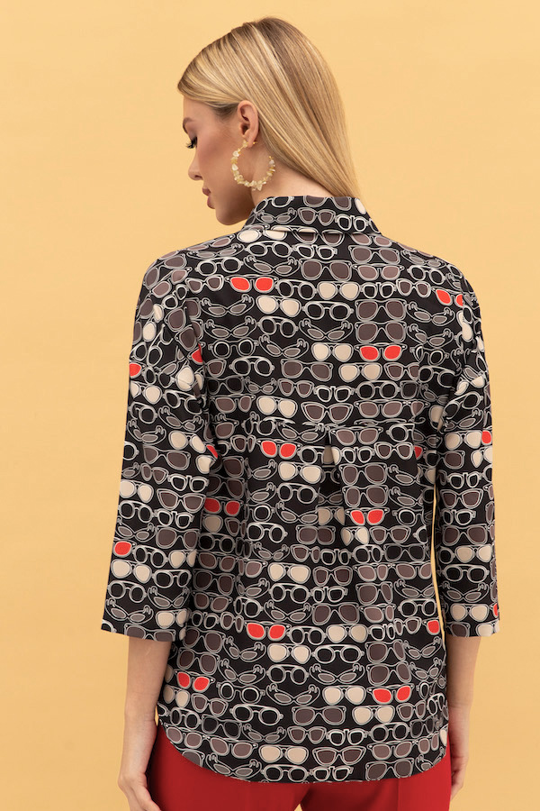 Блуза-рубашка свободного силуэта с застёжкой на пуговицы из вискозной ткани. Низ изделия с закруглениями по бокам. Втачной рукав в спущенную пройму. Вырез горловины обработан отложным воротником на стойке. На задней части изделия выполнена кокетка с небольшой складкой. Достоинство этой модели - в способности скрыть некоторые недостатки фигуры.