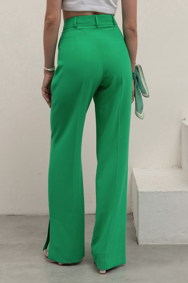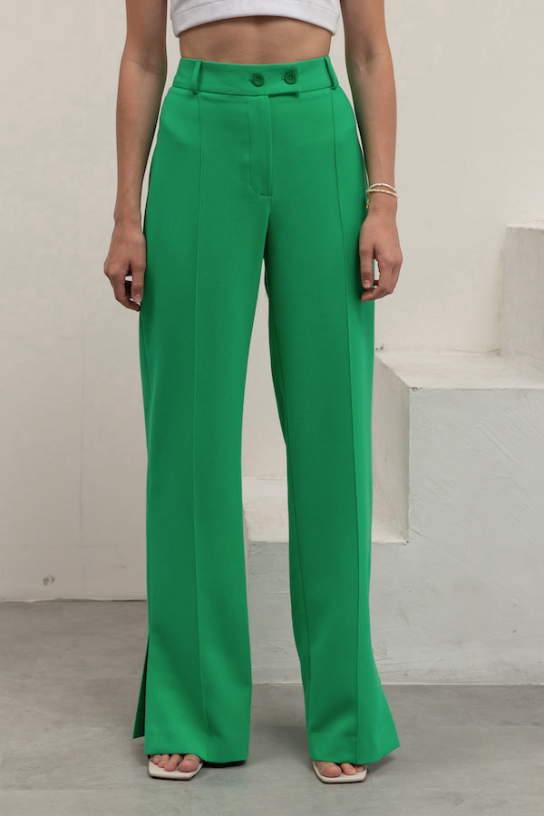 Брюки прямого силуэта с разрезами в боковых швах из костюмной ткани. На передней части брюк застрочены стрелки. Притачной пояс со шлёвками. Застёжка на молнию-гульфик и пуговицу. Секрет такой модели кроется в безупречно точной посадке по талии и бедрам – ничего лишнего, только конструктивные детали, которые придают четкость линиям силуэта.