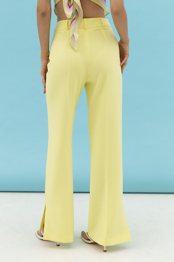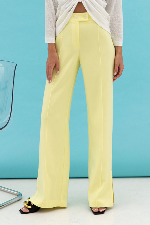 Брюки прямого силуэта, с разрезами в боковых швах из костюмной ткани. На передней части брюк застрочены стрелки. Притачной пояс со шлёвками. Застёжка на молнию-гульфик и пуговицу. Секрет такой модели кроется в безупречно точной посадке по талии и бедрам – ничего лишнего, только конструктивные детали, которые придают четкость линиям силуэта.