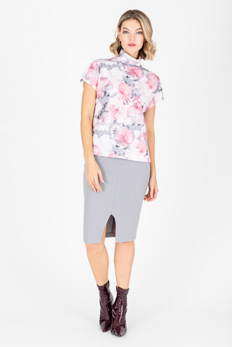 Платье с запахом фиксирующимся притачным поясом выполнено из плательной ткани. Отрезное в области талии. Лиф прилегающий. Юбка летящего силуэта. Укороченный втачной рукав со сборкой по окату.
