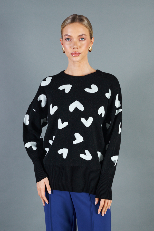 Джемпер свободного силуэта с узором «сердечки» на передней части. Изделие со спущенной линией плеча и длинным рукавом. Низ изделия и низ рукава с высокой резинкой. Круглый вырез горловины оформлен резинкой-бейкой. Изделие выполнено из мягкой структурированной пряжи.