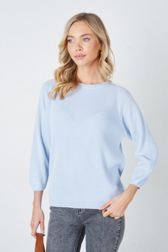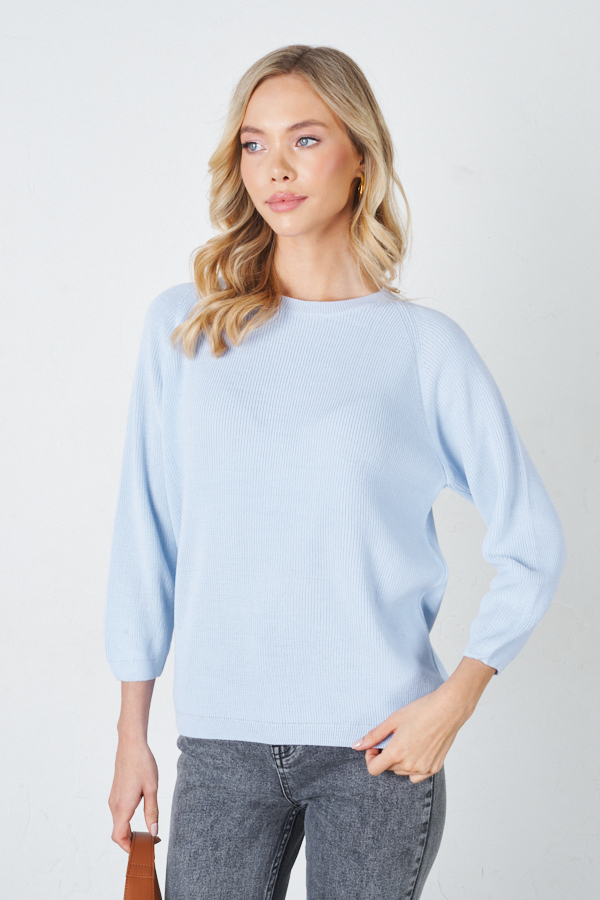 Джемпер прямого силуэта с фактурой «жемчужный узор». Рукав реглан. Круглый вырез горловины, низ изделия и низ рукава оформлены резинкой. Изделие выполнено из мягкой структурированной пряжи.