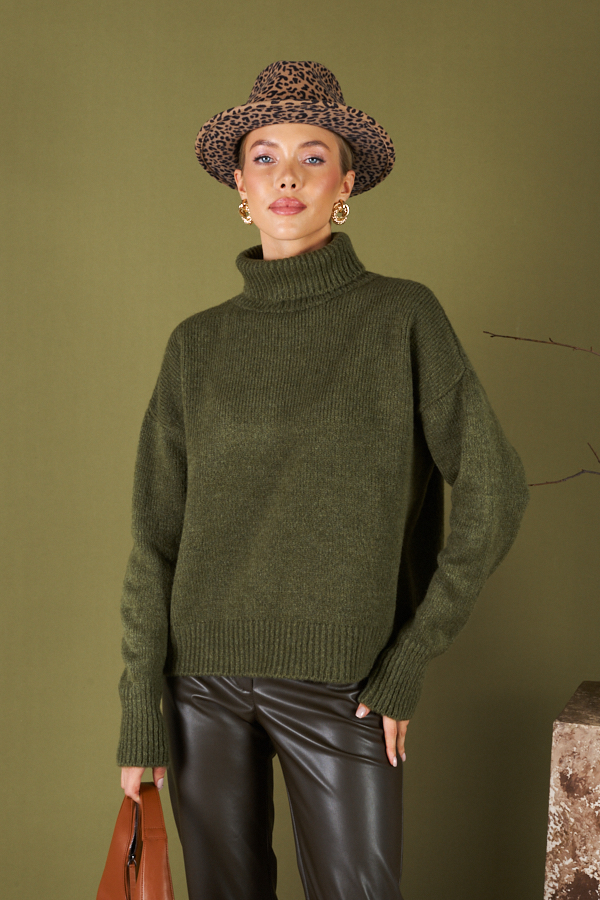 Джемпер свободного силуэта со спущенной линией плеча и длинным рукавом. Низ изделия и низ рукава оформлены резинкой, воротник-стойка с отворотом. Изделие выполнено из мягкой пряжи.