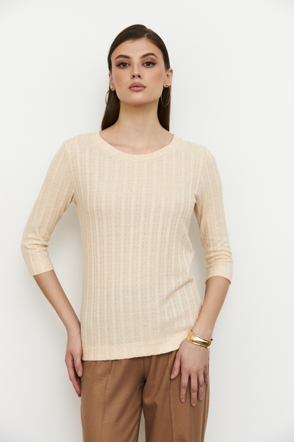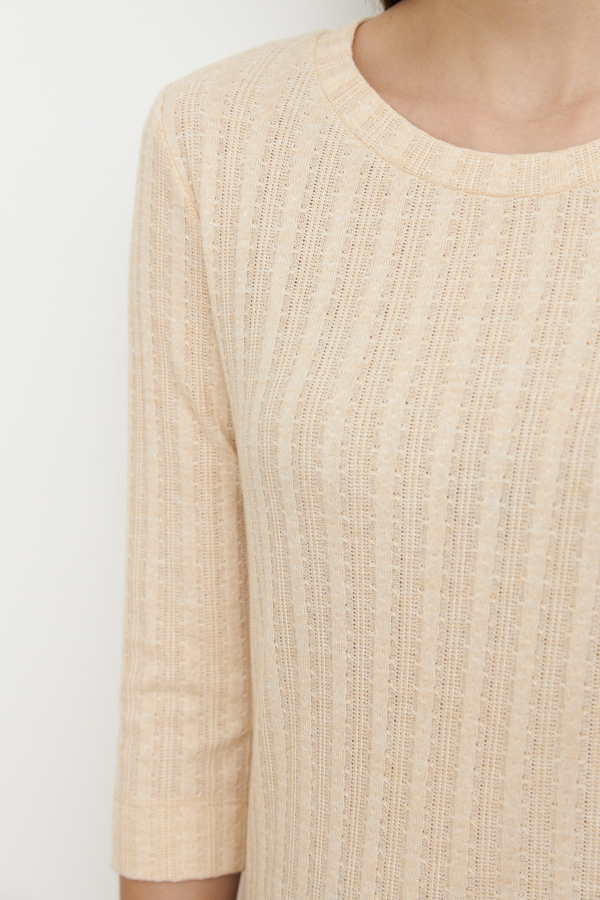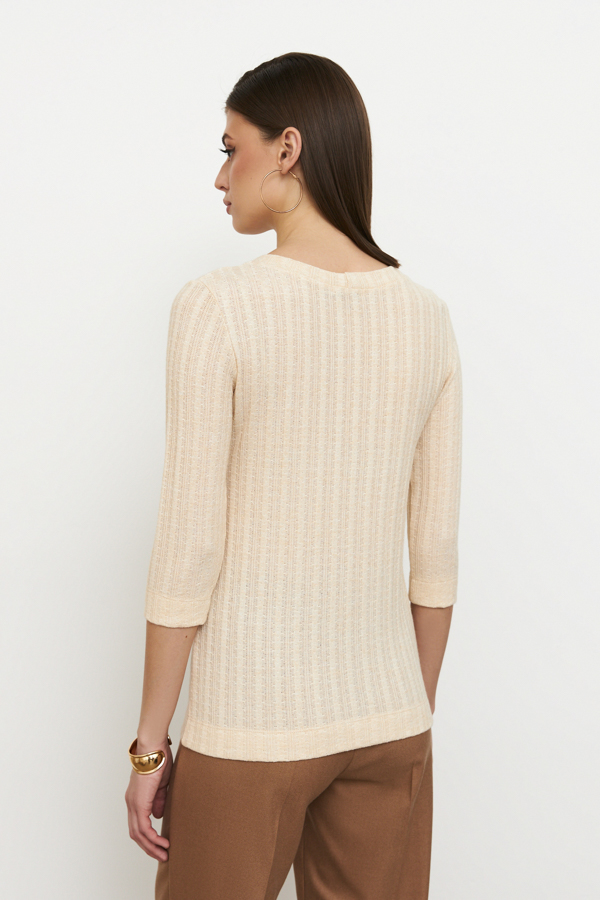 Джемпер прилегающего силуэта из фактурного эластичного полотна. Втачной рукав 3/4. Круглый вырез горловины оформлен бейкой.