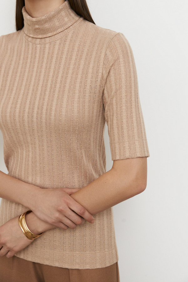Джемпер прилегающего силуэта из фактурного эластичного полотна. Втачной короткий рукав. Вырез горловины высокая стойка. Джемпер – это хорошая базовая вещь, подходящая для любого гардероба.