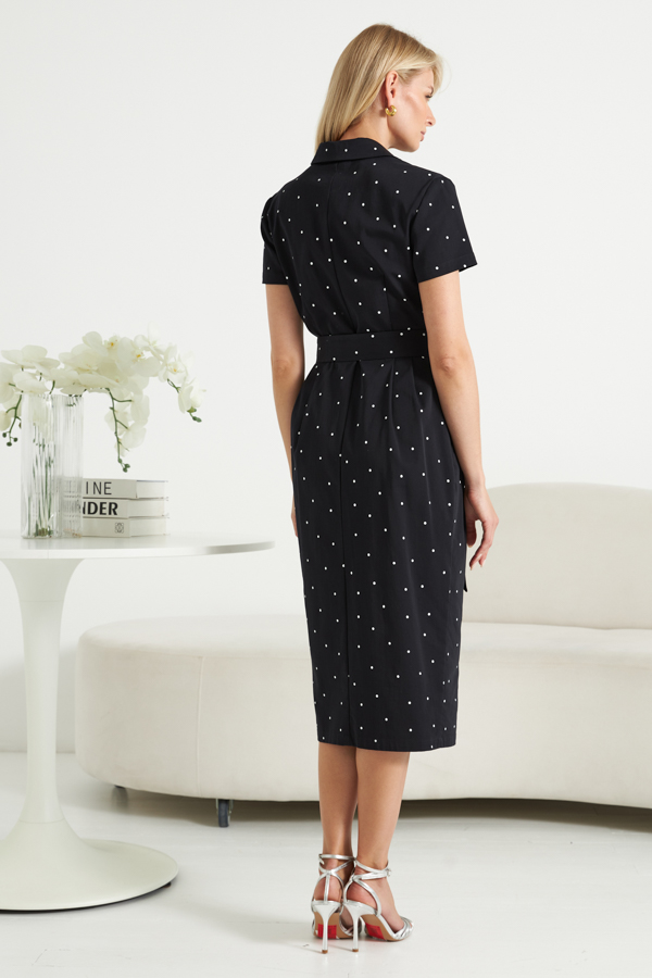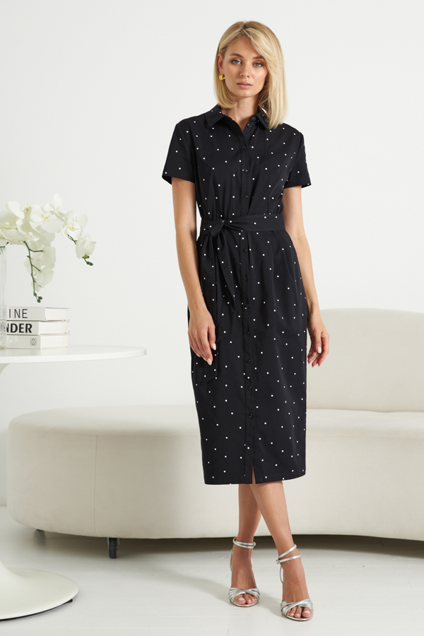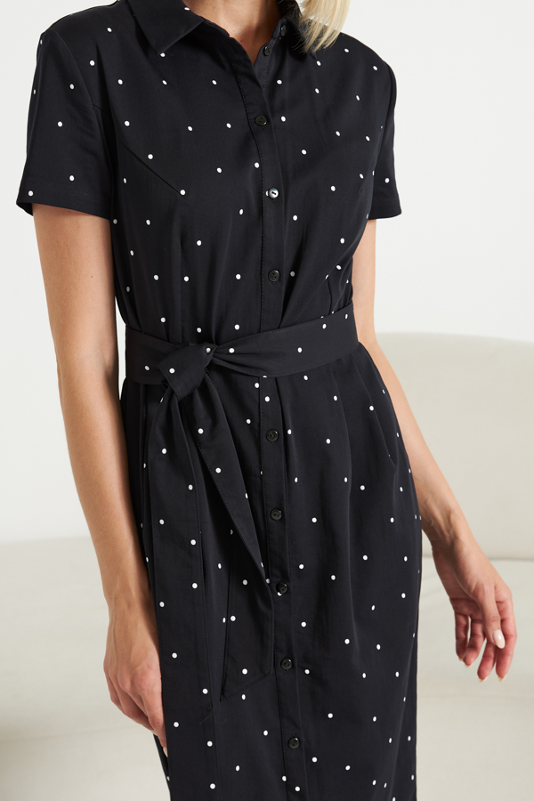 Платье приталенного силуэта из хлопковой плательной ткани. Изделие отрезное по линии талии с защипами. В боковых швах карманы. Втачной короткий рукав. Притачная планка с застёжкой на пуговицы. Вырез горловины обработан отложным воротником на стойке. В комплекте пояс из основной ткани.