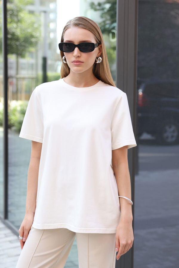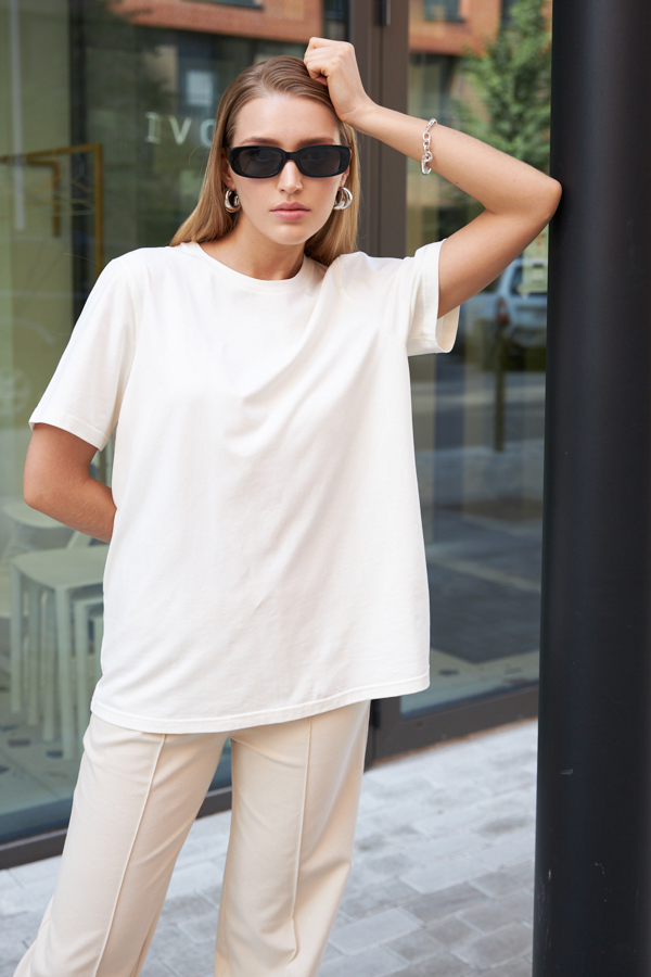 Джемпер свободного силуэта из хлопкового эластичного полотна. Втачной короткий рукав. Круглый вырез горловины оформлен бейкой.