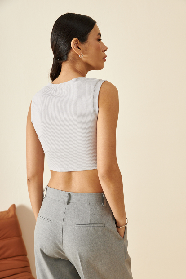 Укороченный топ на лямках из эластичного полотна в рубчик. Прилегающий силуэт. Круглый вырез горловины и линия проймы оформлены бейками.