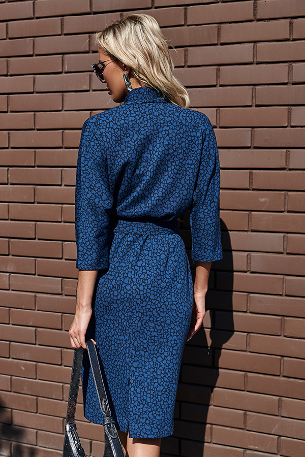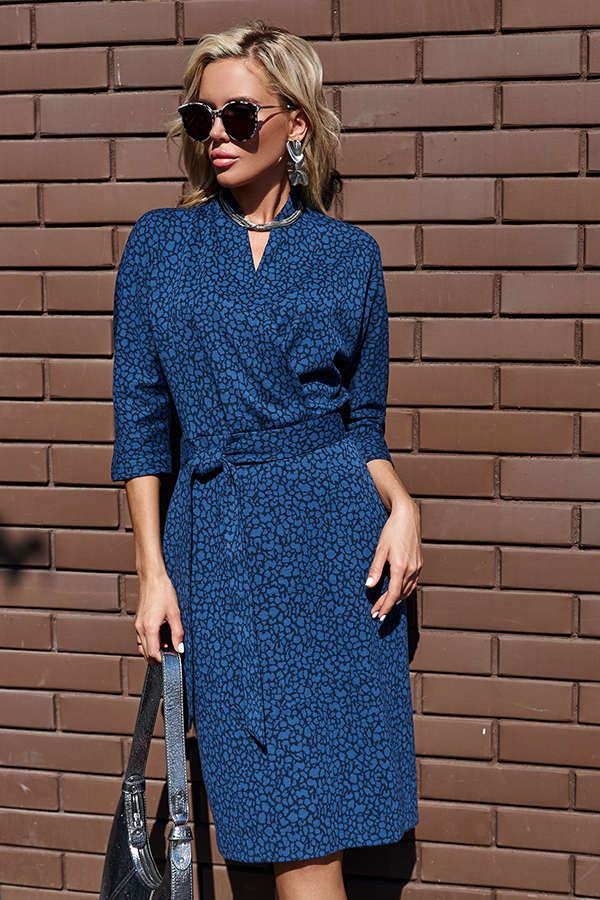 Платье из эластичного полотна с жаккардовым анималистичным узором. Изделие свободное в верхней части и прилегающее в области талии и бёдер. Лиф изделия оригинального кроя в стиле кимоно. Цельнокроеная стойка переходящая в запах, визуально делает фигуру стройнее. По центру задней части платья выполнен шов, снизу небольшой разрез. В комплекте пояс. В таблице размеров представлены параметры человека, а не изделия.