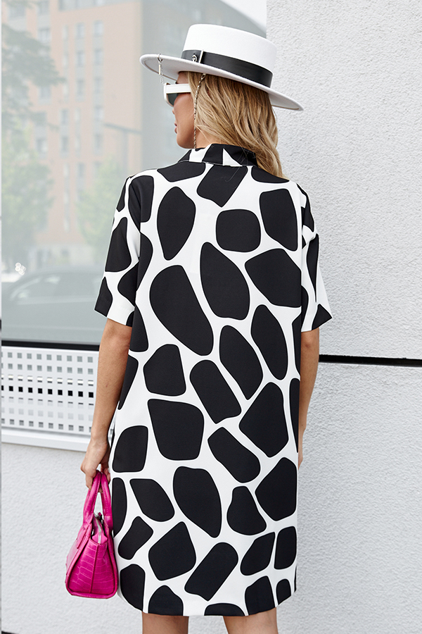 Платье свободного силуэта из плательной ткани. По центру передней части изделия выполнен шов. Цельнокроеная стойка, переходящая в V-образный вырез горловины, визуально делает фигуру стройнее. Втачной короткий рукав.
