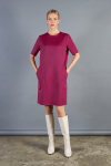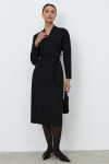 Платье свободного силуэта из фактурного эластичного полотна. V-образный вырез горловины обработан притачной планкой. Втачной длинный рукав в спущенную пройму с манжетой. Манжет рукава и планка выполнены из ткани-компаньона.