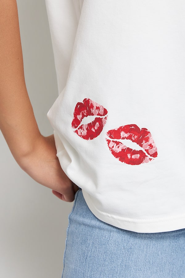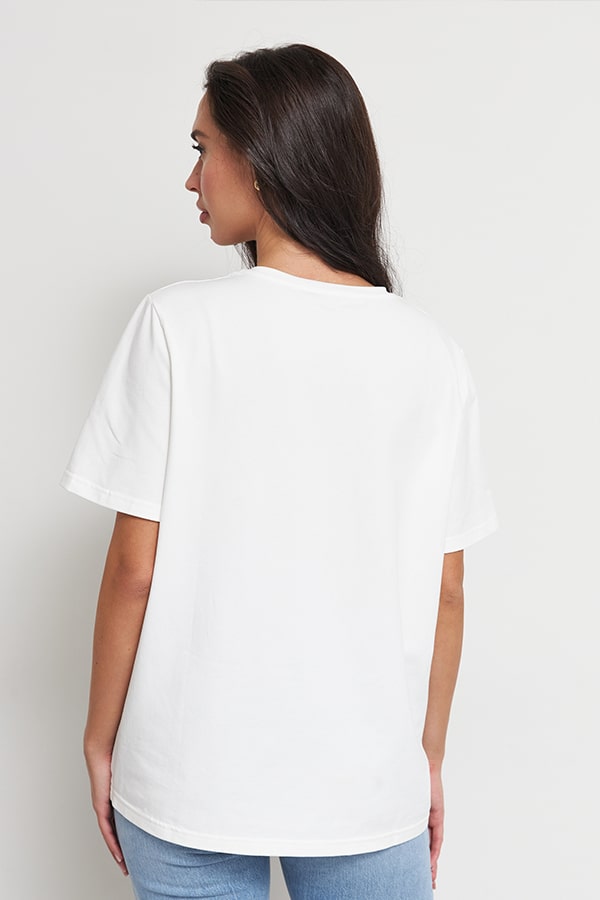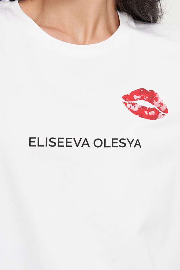 Джемпер свободного силуэта из хлопкового эластичного полотна. Втачной короткий рукав. Круглый вырез горловины оформлен бейкой. На передней части изделия нанесён принт методом шелкографии.